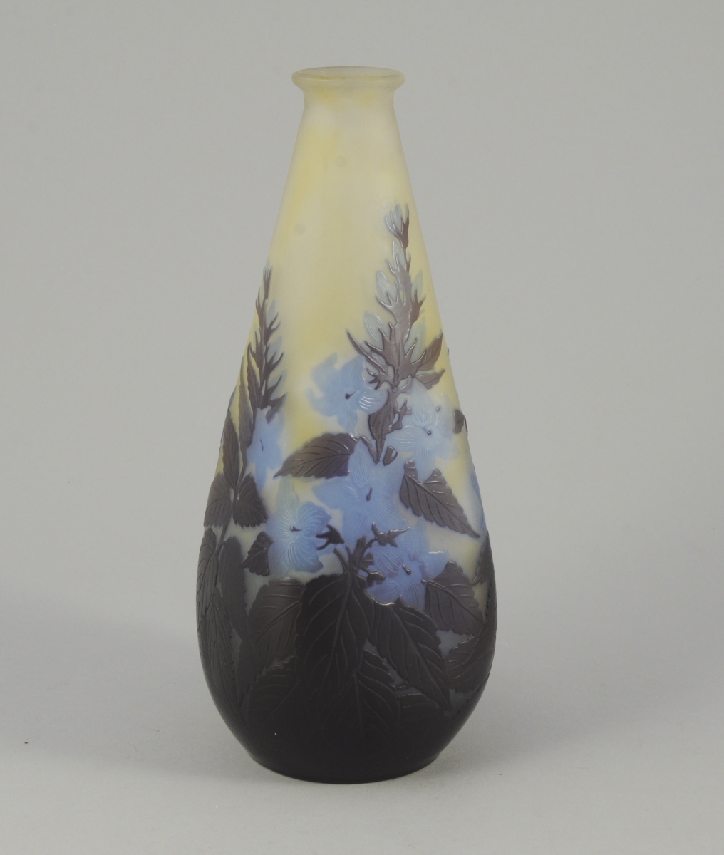 Émile GALLÉ (1846 -1904). VASE tronconique méplat à col étranglé en pâte de verre à décor de campanules de couleur violacée dégagés à l'acide. Signé. Vers 1900. Haut. 23, 5 cm. Larg. 8,6 cm.