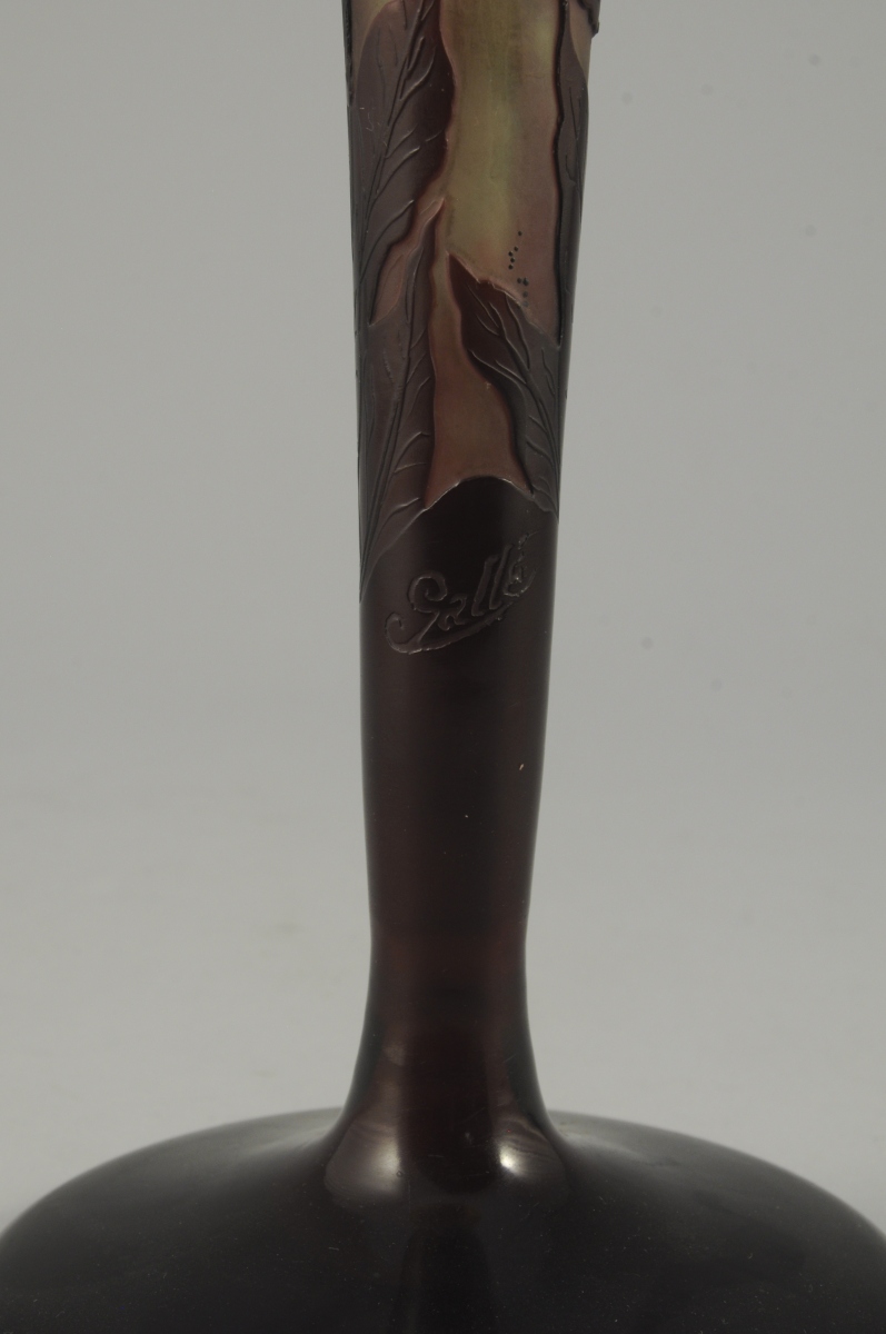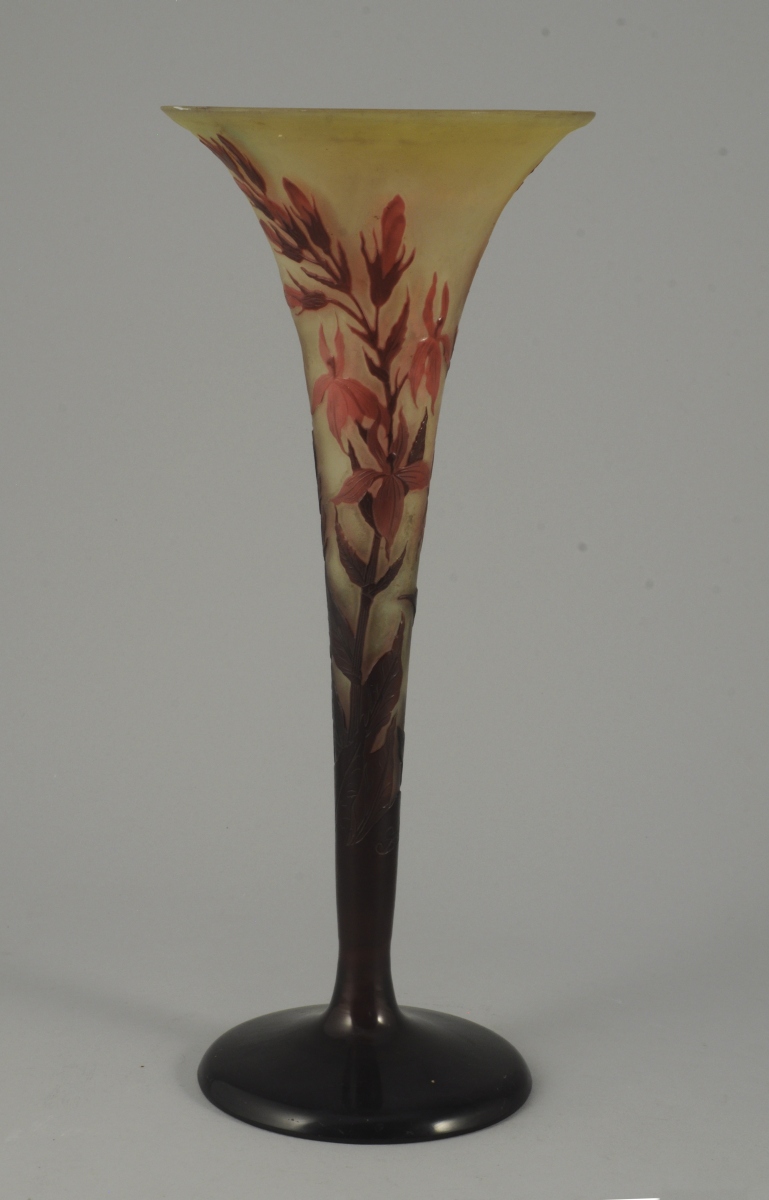 Émile GALLÉ (1846 - 1904). VASE de forme tulipe en verre multicouches, gravé à l'acide. Décor de fleurs rouges (lys?) sur fond opalescent orangé. Signé "Gallé". Haut. 36, Diam. 15 cm.