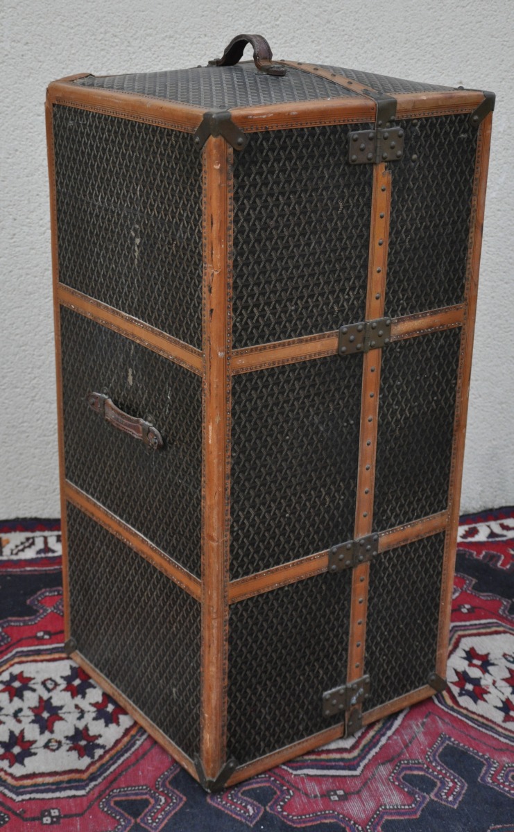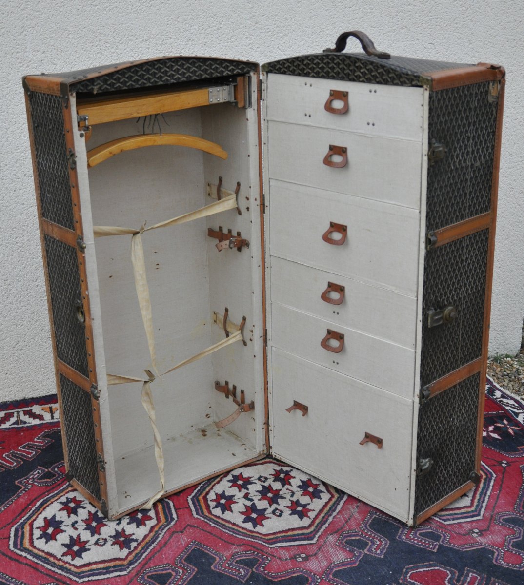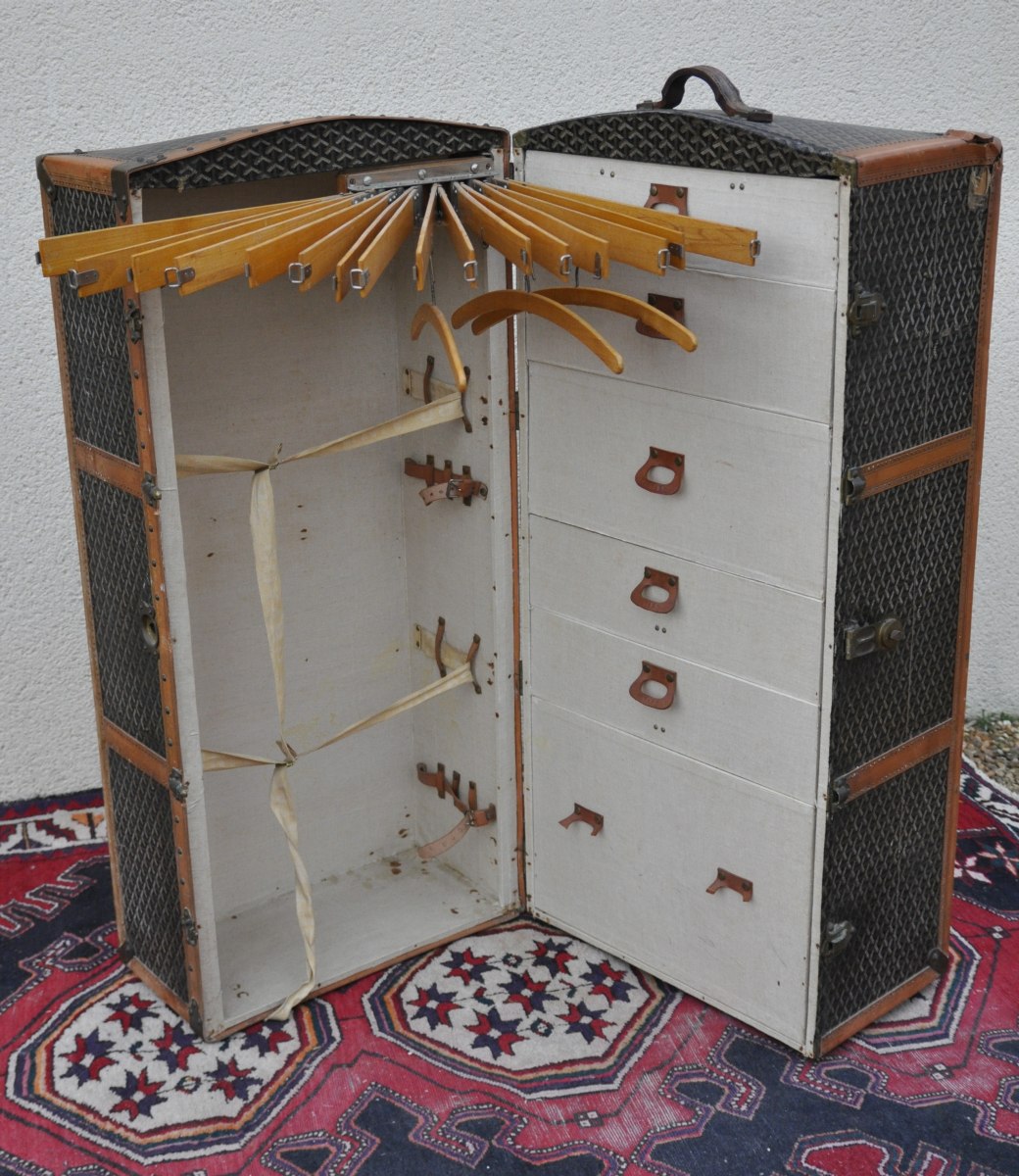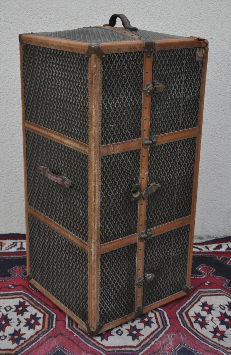 GOYARD. MALLE-CABINE en bois gainé de toile enduite à motif de chevrons. Renforts d'angles en laiton. Elle est munie de trois poignées de cuir fauve. L'intérieur recouvert de toile écru découvre six tiroirs, dont un compartimenté, et une penderie supportant huit cintres de bois. Elle repose sur huit roulettes.
