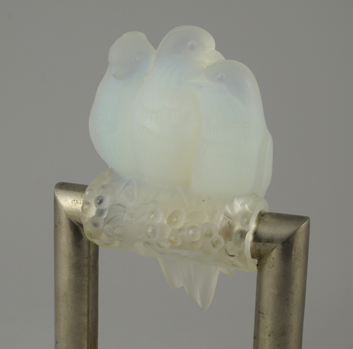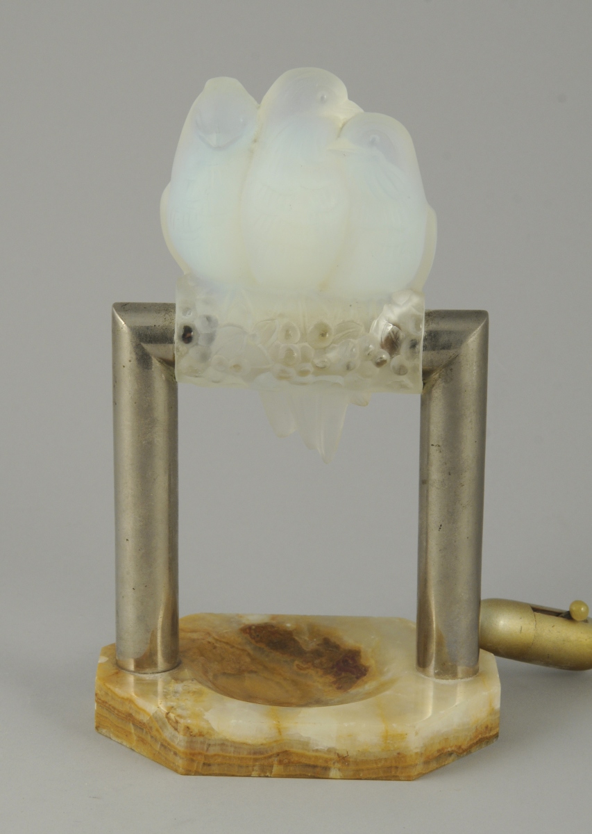 ETLING FRANCE. LAMPE en verre opalescent pressé moulé représentant trois oiseaux branchés. Le piètement octogonal en onyx et métal. Signée et numérotée "118".