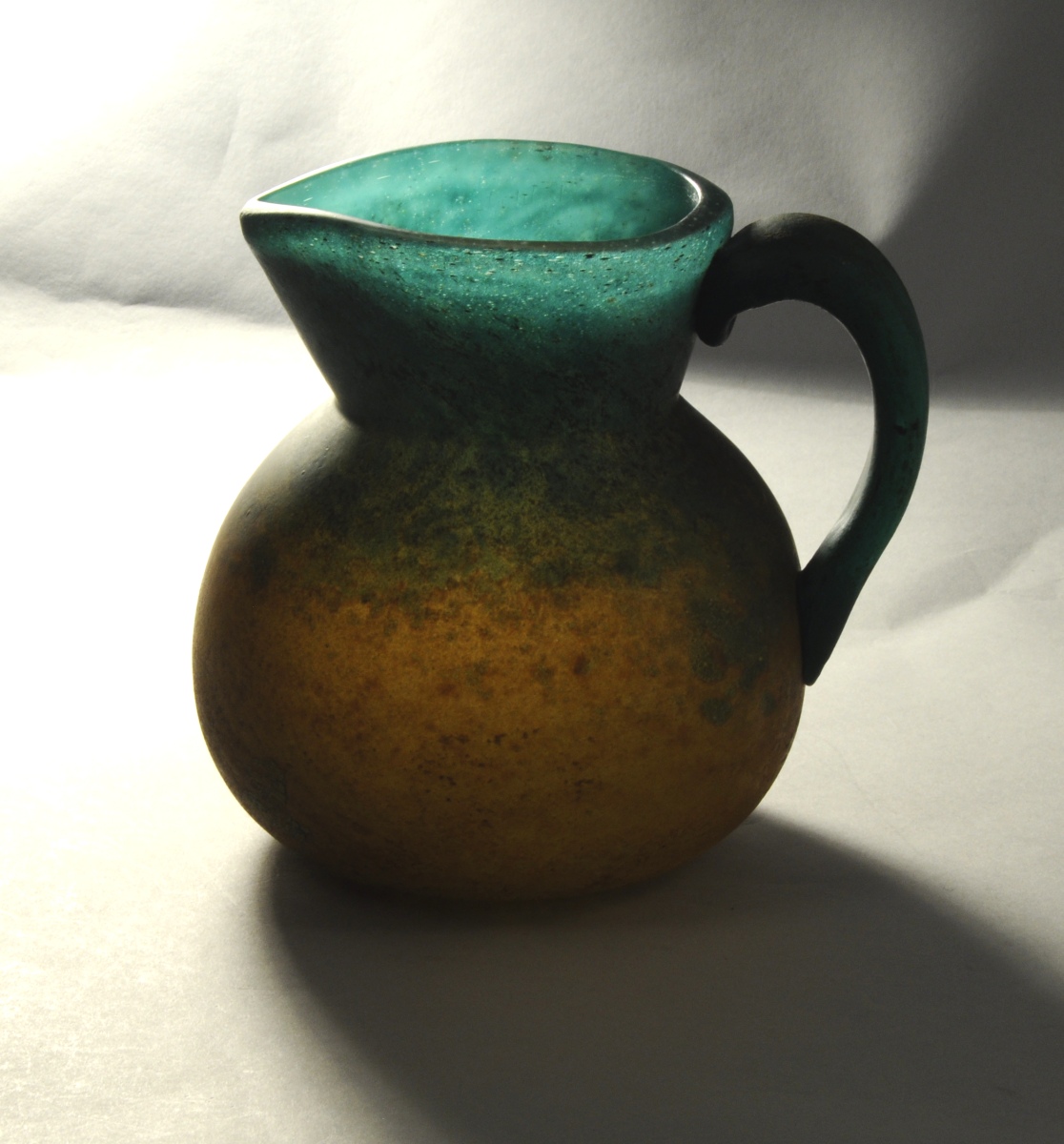 Georges DE FEURE et DAUM. Pichet à large panse en verre opaque vert et orangé, anse appliquée.