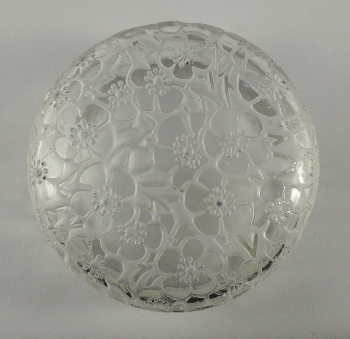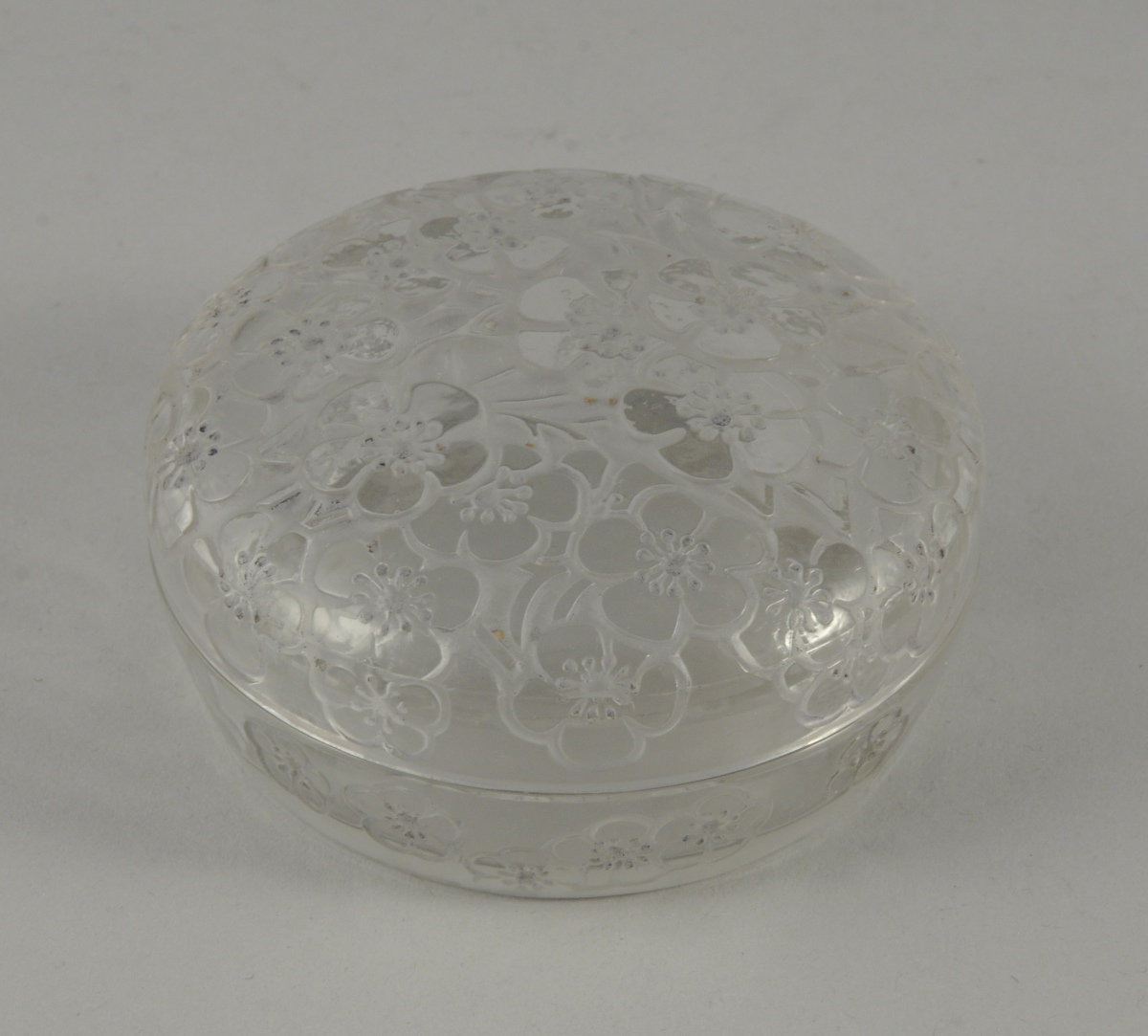 René LALIQUE (1860-1945). BOÎTE couverte en verre blanc moulé-pressé à décor floral, modèle "Émiliane" dit aussi "Églantines" créé 1920. Signée "R.Lalique France". Diam. 8 cm.