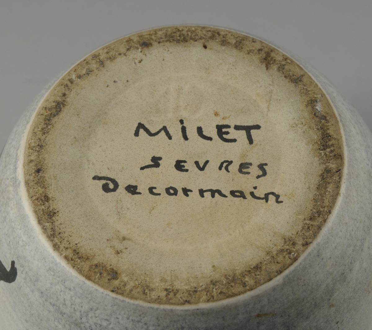 Vase CIRCULAIRE en céramique vernisée ornée de deux personnages agenouillés tenant un flambeaux et de deux étoiles à figures noires sur fond gris. Signé "Millet Sevre décormain".