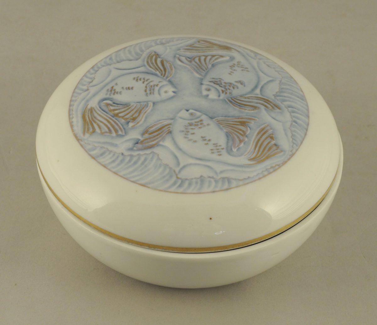 Jacques PERRIN (né à Tours en 1920) pour l'Ecole Nationale Professionnel de Vierzon dans les années 1937-1939. BONBONNIERE de forme ronde en porcelaine blanche, le couvercle orné de trois carpes bleue rehaussées à l'or, liseré or. Non signée. Hauteur 7,5, Diamètre 15,5 cm.