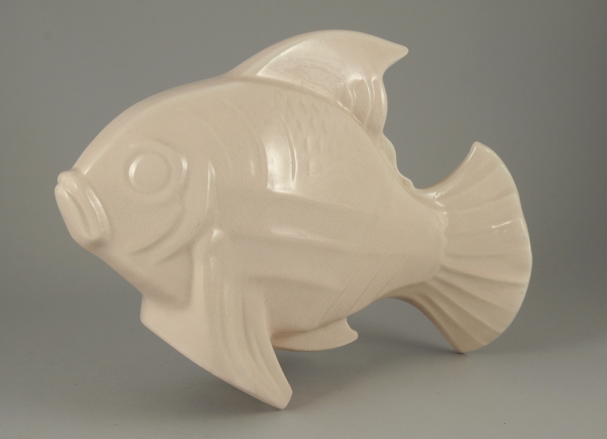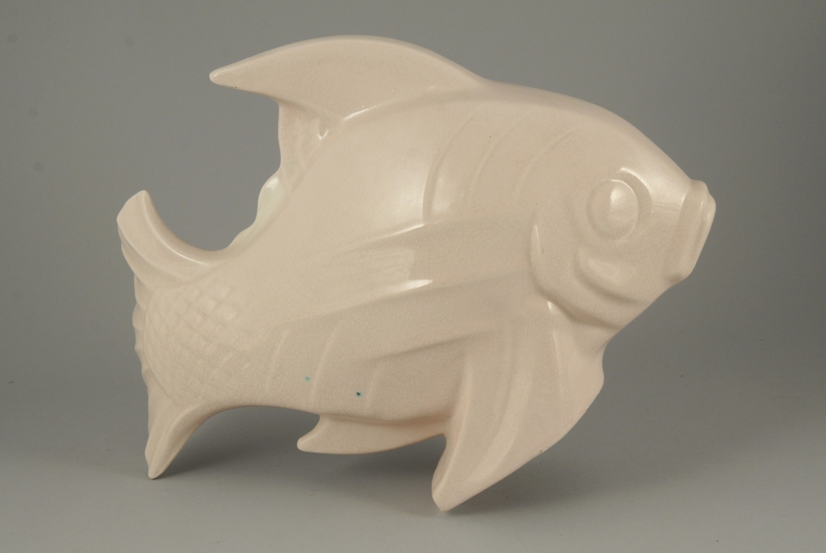 JOINT : POISSON en céramique craquelé rosée d'après le travail de LEJAN en 1934 pour Manufrance. Style Art Déco, travail moderne. Hauteur 30, Longueur 40 cm