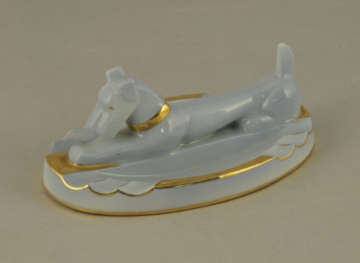 Jacques PERRIN (né à Tours en 1920) pour l'Ecole Nationale Professionnel de Vierzon dans les années 1937-1939. CENDRIER FOX TERRIER et SIX PORTE-COUTEAUX FOX TERRIER en porcelaine blanche ou bleutée rehaussée d'or.
