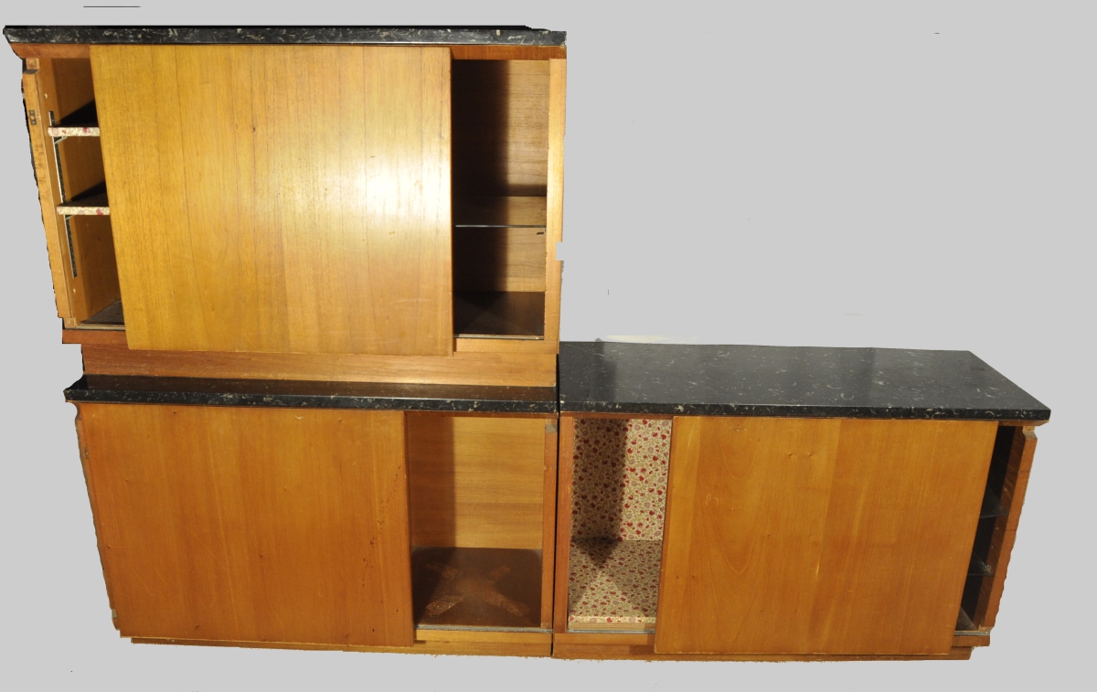 TROIS CAISSONS formant enfilade en bois naturel ouvrant par une porte coulissante sur des étagères. Dessus de marbre anthracite.