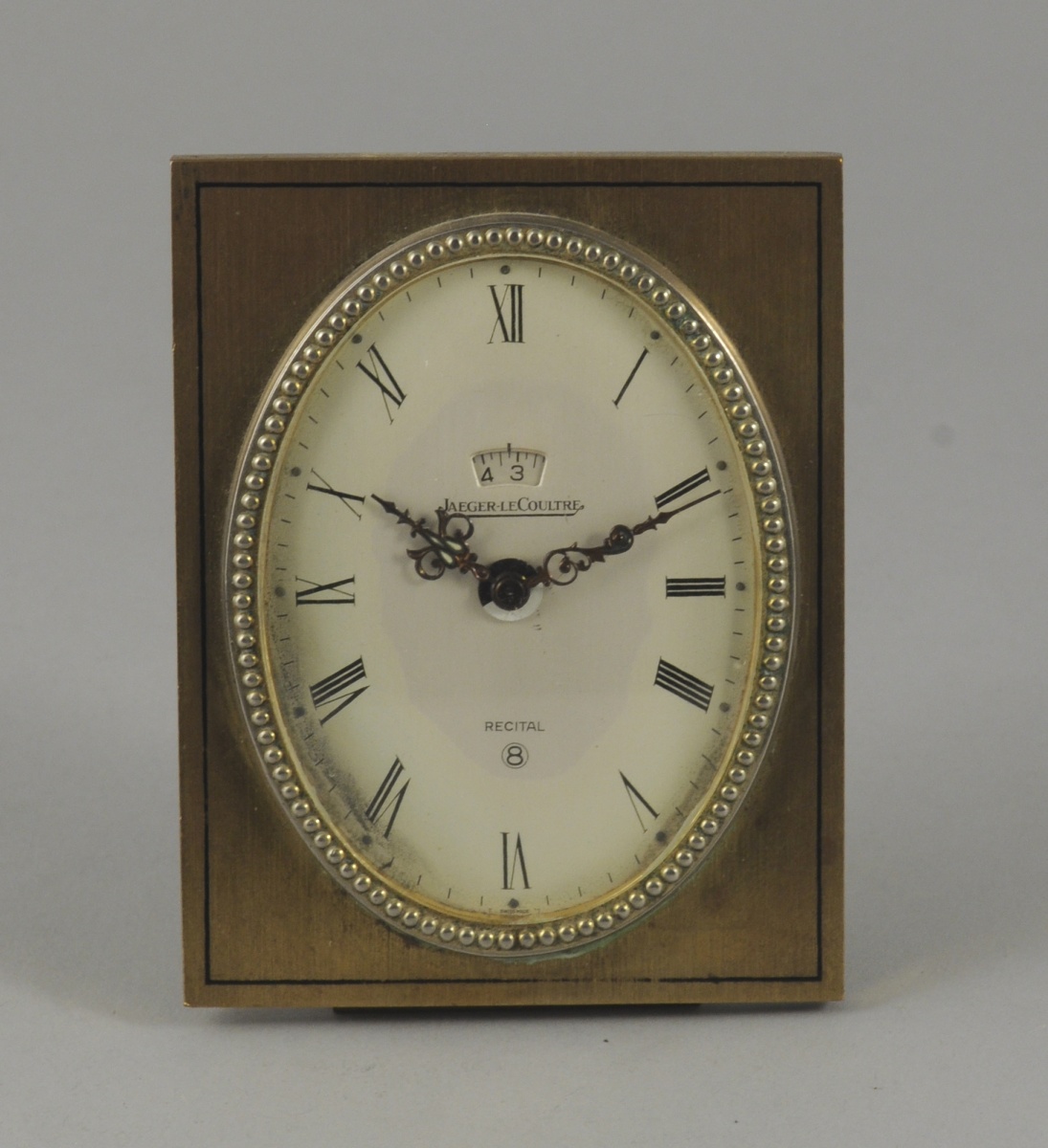 JAEGER-LE-COULTRE. RÉVEIL en métal doré. Cadran ovale émaillé avec chiffres romains. Années 1960. Haut. 9, Larg. 7 cm.