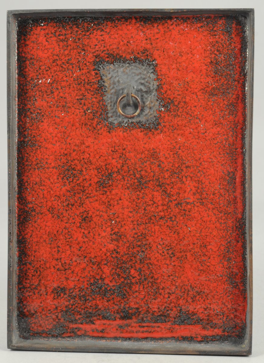 Hauteur : 25,9, Largeur : 18,5, Profondeur 1,5 cm. (éclats à l'émail)
