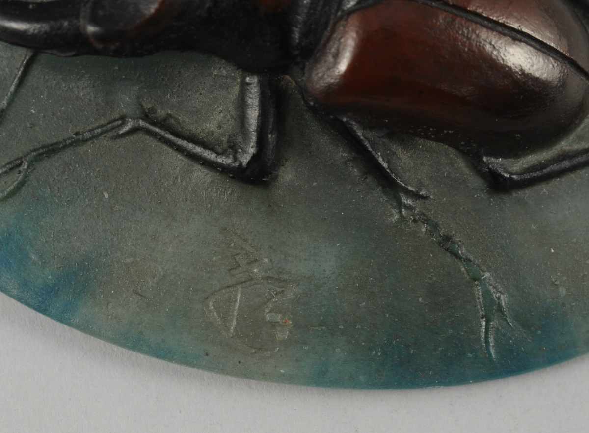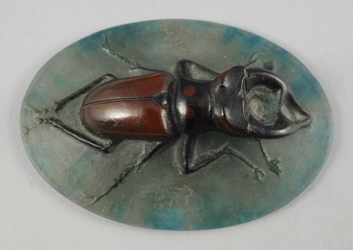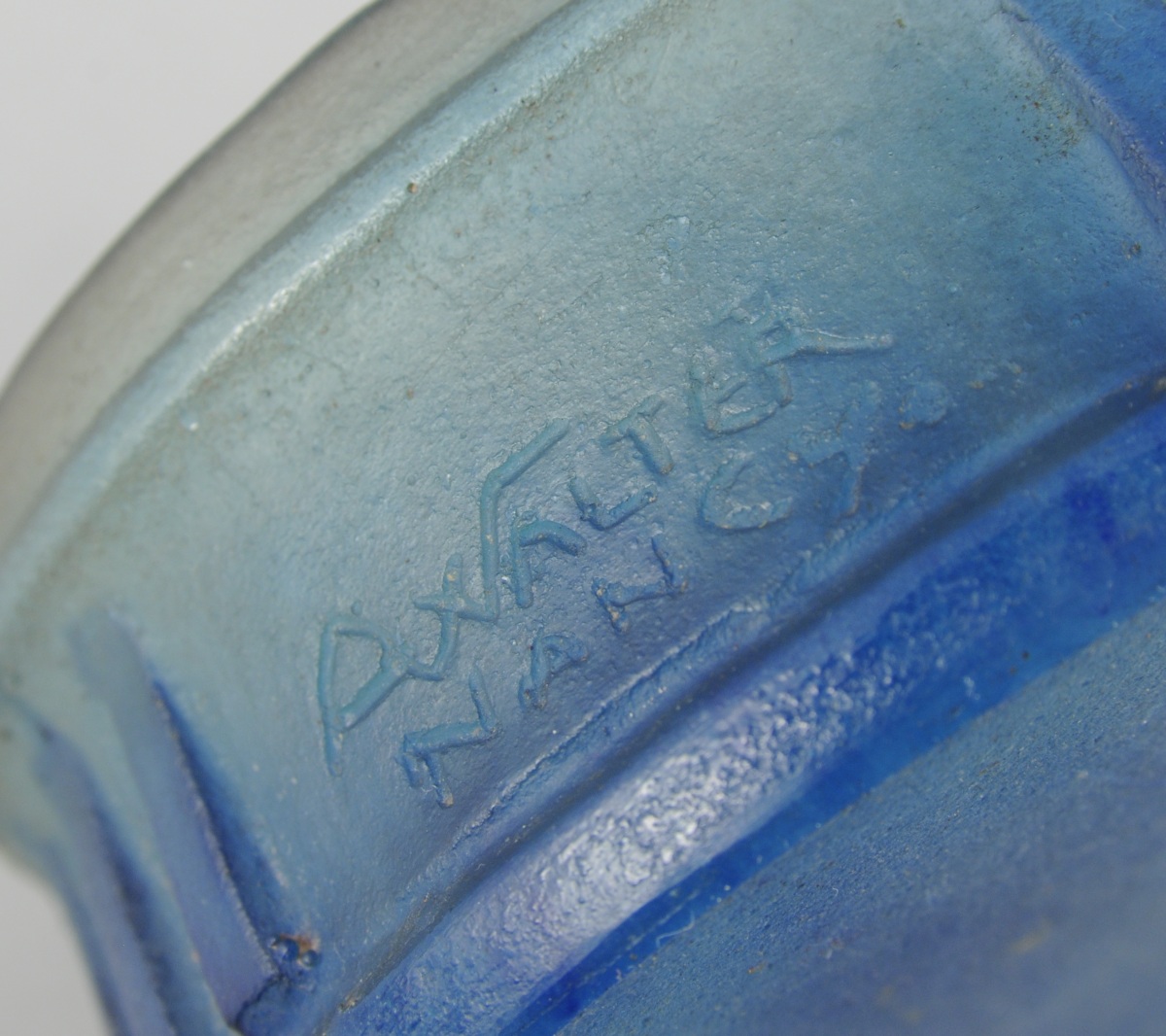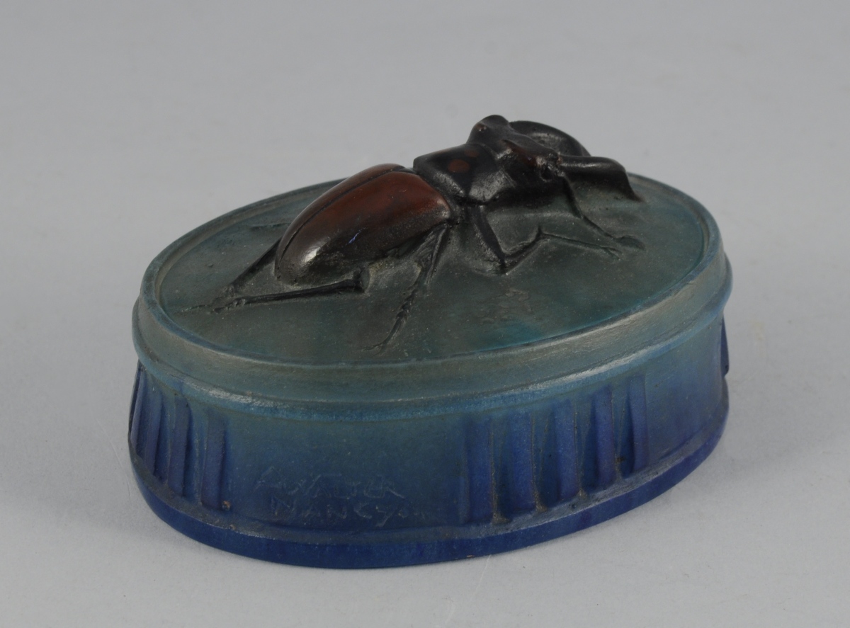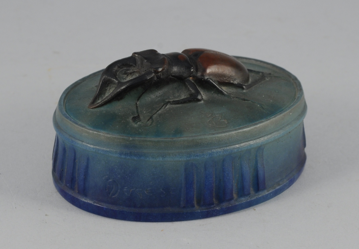 BOÎTE de forme ovale en pâte de verre bleu contrasté. Décor en relief sur le couvercle d'un lucane cerf-volant brun. Signée "A WALTER NANCY." et "Bergé Sc". Monogrammée "AW N" et "B Sc" sur le couvercle.