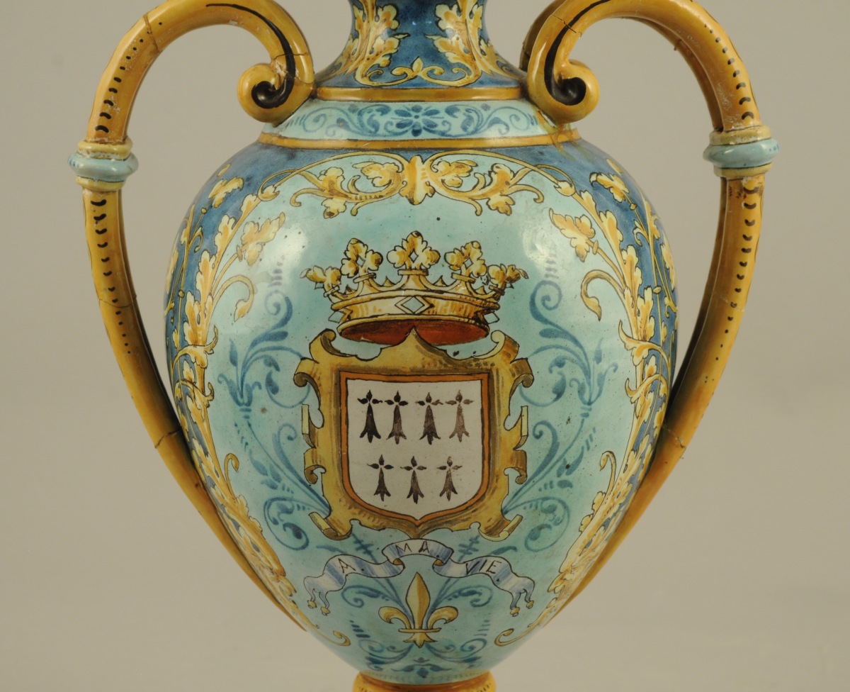 Décor aux armoiries et aux emblèmes dans des entrelacs feuillagés : fleurs de lys et porc-épic de Louis XII, et hermine pour Anne de Bretagne, sur les vases. Salamandre et cygne transpercé pour François Ier et Claude de France sur la vasque.