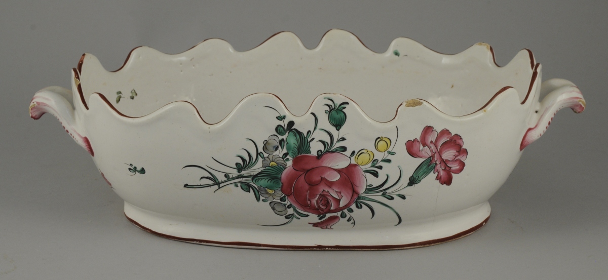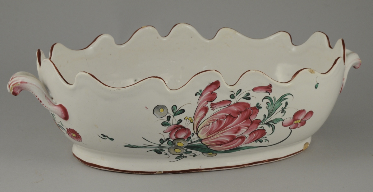 EST. RAFRAÎCHISSOIR À VERRES à bords chantournés en faïence stannifère à décor émaillé vert, gris, jaune et pourpre de cassius de petit feu de bouquets de fleurs et branches fleuries et feuillagées.