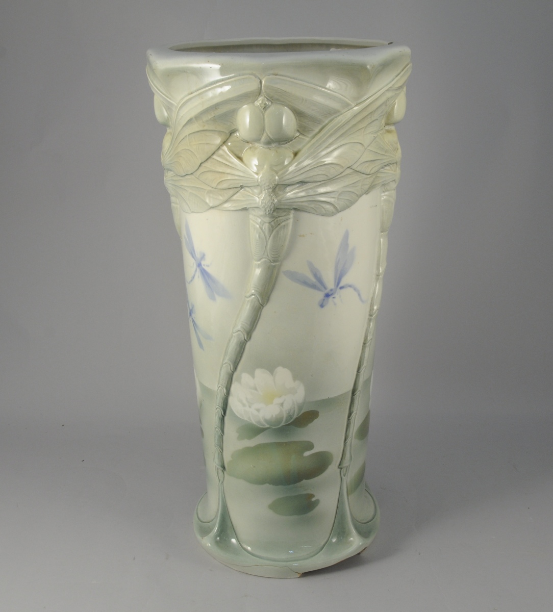 LUNÉVILLE, KELLER et GUÉRIN. Grand vase cornet en faïence polychrome à décor de feuilles et fleurs de nénuphar et de libellules en vol. Quatres libellules en relief soutiennent le col de leurs ailes. Signé et marqué en creux "93".
