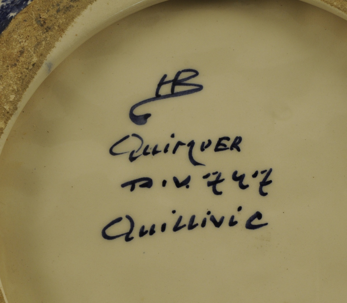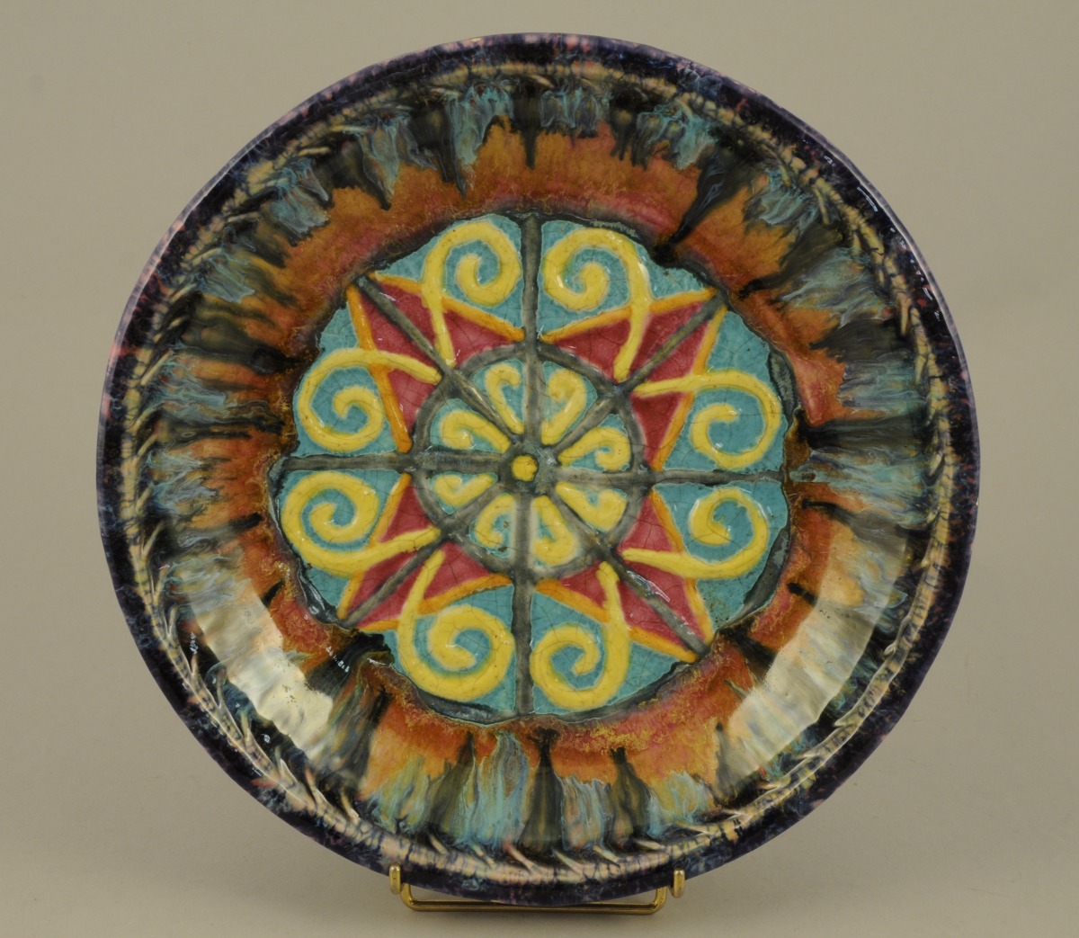 QUIMPER. René QUILLIVIC (1879-1969). Plat rond en faïence polychrome décoré au centre d'un motif celtisant en relief et de coulures sur le marli. L'extérieur émaillé bleu poudré. Quimper, manufacture de La Hubaudière. Signé.