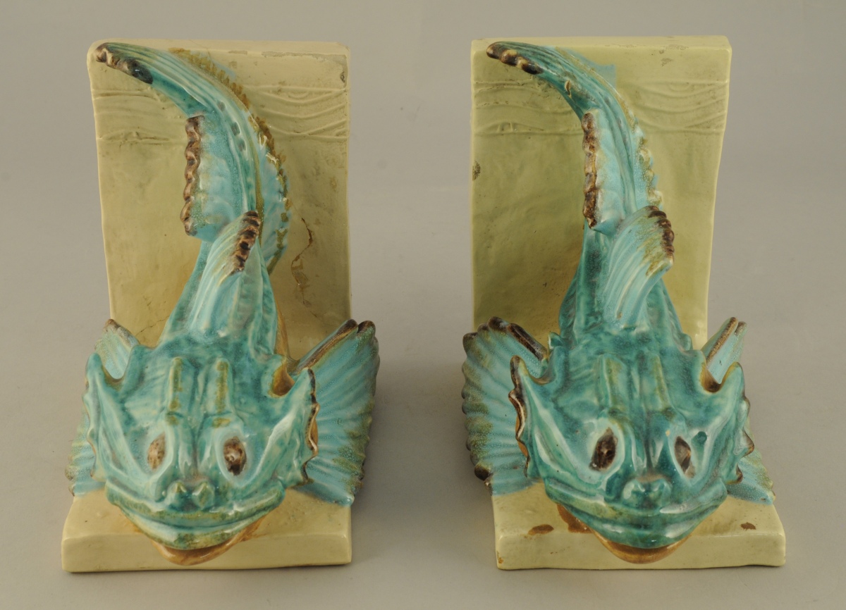 PAIRE de SERRE-LIVRES en faïence polychrome figurant une rascasse. Signé et numéroté 41.
