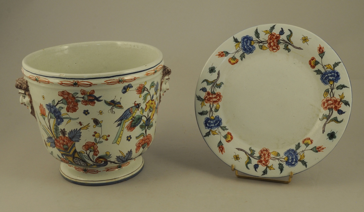 ROUEN. CACHE-POT en faïence et son plateau. Décor polychrome "à la corne d'abondance", filets bruns et bleus sur le bord. Prises en forme de mascarons.