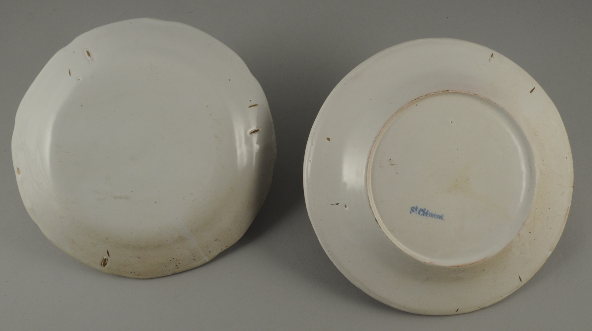 SAINT-CLÉMENT. DEUX ASSIETTES en faïence à décor polychrome, pour l'une d'un panier fleuri au centre et de peignés pourpre sur le bord; pour l'autre de jetés de fleurs et filet pourpre sur le bord, marquée au revers "Saint Clément". L'une à bord chantourné. Fin XIXème-début XXème. Diam. 23 cm. (égrenures, manques à l'émail)