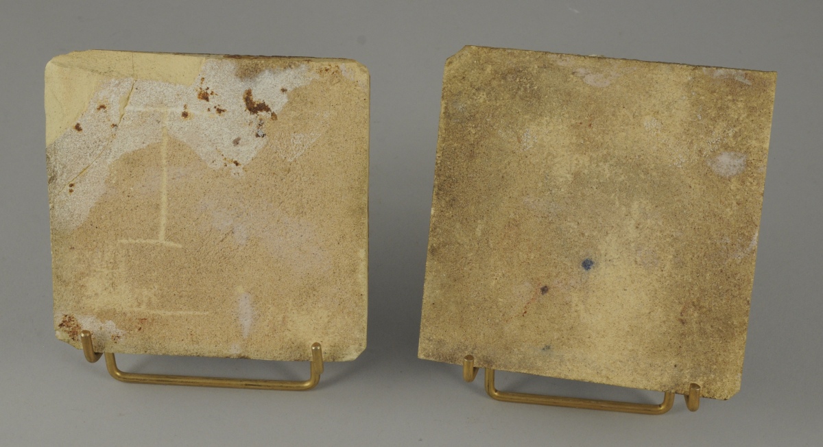 DELFT. DEUX CARREAUX en faïence à décor camaïeu bleu représentant une scène de patinage et un port dans un encadrement de rinceaux et agrafes. Fin XVIIIème.