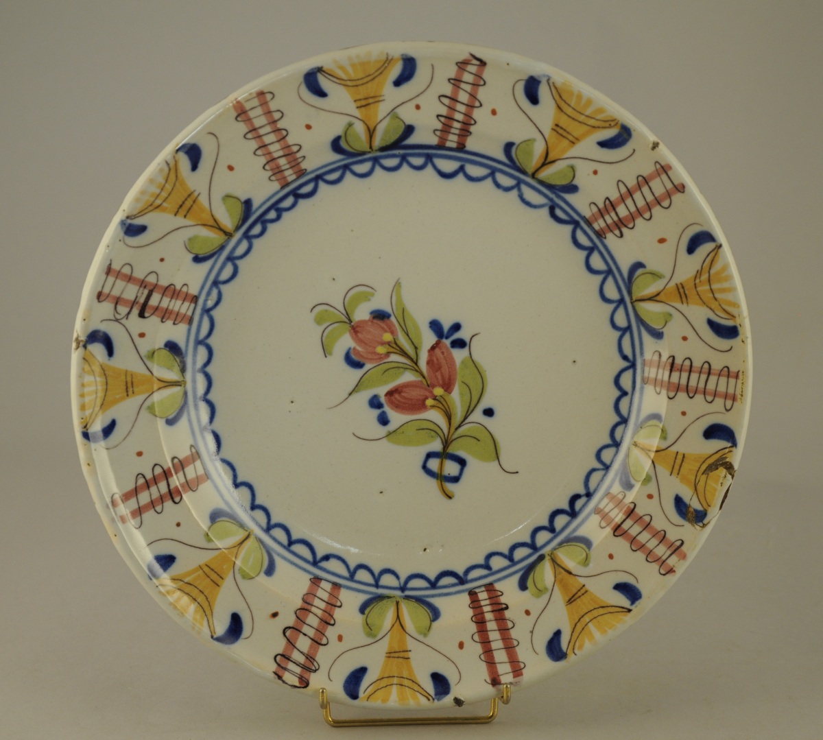 DELFT. Deux PLATS ronds en faïence stannifère à décor polychrome de grand feu. L'un à motif d'une coupe de fruits et marqué "Delft" ; l'autre à décor de fleurs stylisées et marqué "RG".