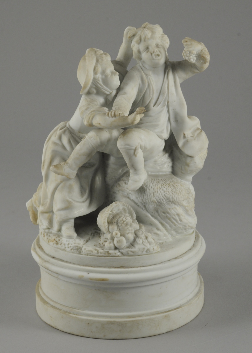 NIDERVILLER. GROUPE en BISCUIT représentant deux enfants se disputant une grappe de raisin. Socle circulaire mouluré. Marqué "NIDERVILLER N°102" sur le socle.