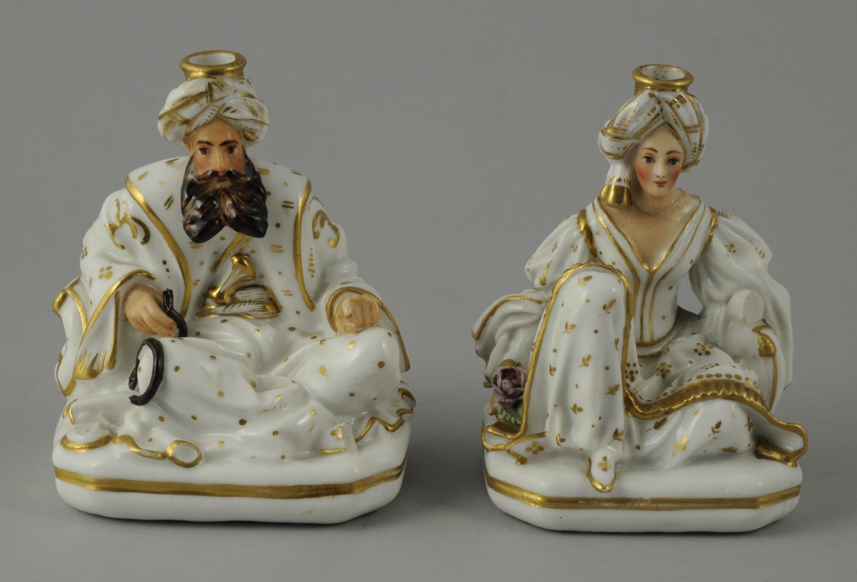 PAIRE de FLACONS à senteurs en porcelaine polychrome et or figurant un sultan et une sultane assis et accoudés contre des coussins. La femme tient une rose, l'homme fume la pipe. Marqués "JP" à l'encre bleue pour Jacob Petit.