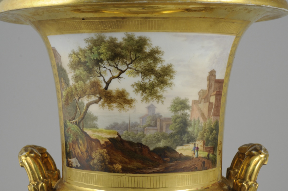 PARIS. VASE MÉDICIS en porcelaine à fond doré décoré d'un cartouche peint de personnages dans des ruines, anses à double tête d'hercule.