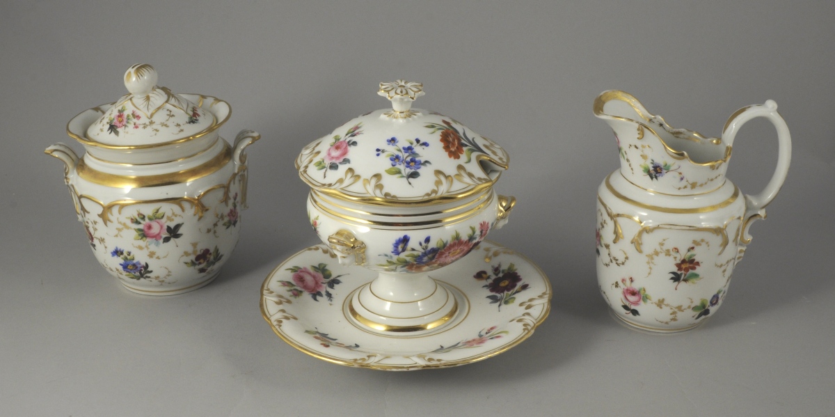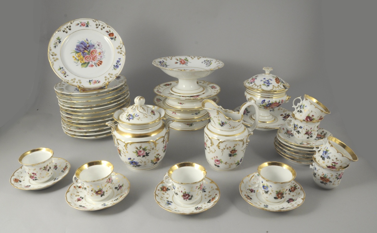 VIEUX PARIS. PARTIE de SERVICE en porcelaine comprenant un confiturier, un sucrier, un pot à lait, une coupe, trois assiettes montées, huit tasses, dix sous-tasses et 13 assiettes à dessert. Décor polychrome et or de bouquets et jetés de fleurs. Rinceaux et filets or sur les bords.
