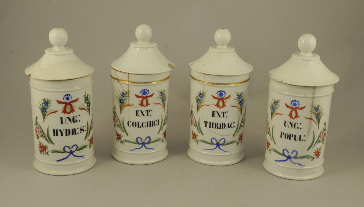 ENSEMBLE de QUATRE POTS à PHARMACIE. Décor polychrome et or de jetés de fleurs, noeuds, médaillons rubanés et filets. Ils portent les inscriptions "UNG: POPUL: - UNG:HYDR:S: -