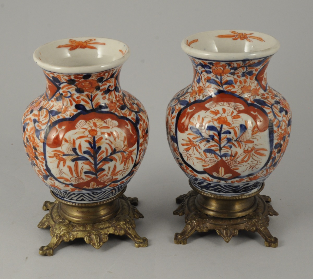 JAPON. PAIRE de VASES balustres en porcelaine à décor Imari. Jetés de fleurs rouges sur l'intérieur du col. Frise de chevrons bleus sur le pied. Montures en bronze doré à décor de godrons, mufles de lions et lambrequins.