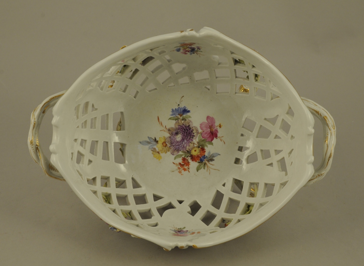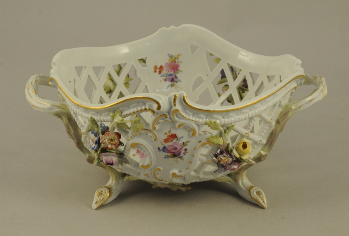 MEISSEN ? CORBEILLE de forme mouvementée en porcelaine ajourée. Décor polychrome au centre d'un bouquet fleuri et sur la panse d'un bouquet fleuri dans un cartouche rocaille, de fleurs et feuillages appliqués et de filets or. Anses et pieds à l'imitation de branchages. Marque aux épées croisées.