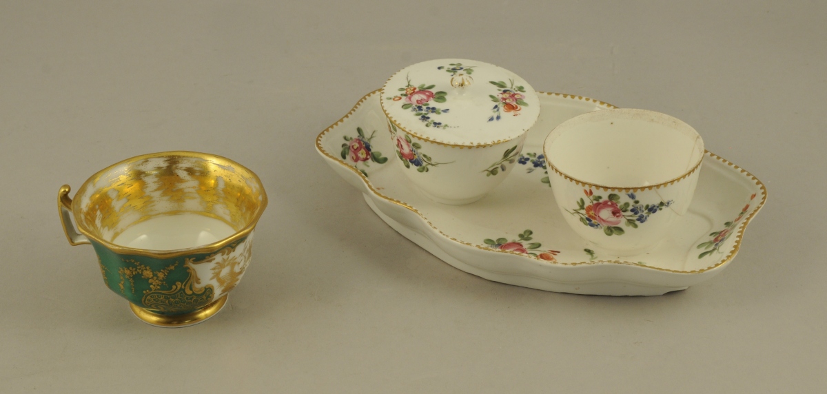 - CONFITURIER double à plateau adhérent mouvementé en porcelaine. Décor polychrome en plein de jetés de fleurs et filets or sur le bord. Fin XVIIIème - Début XIXème. La plus grande, Haut. 6,5, Larg. 23,5, Prof. 16 cm. (fêles, accident, restauration, manque un couvercle)