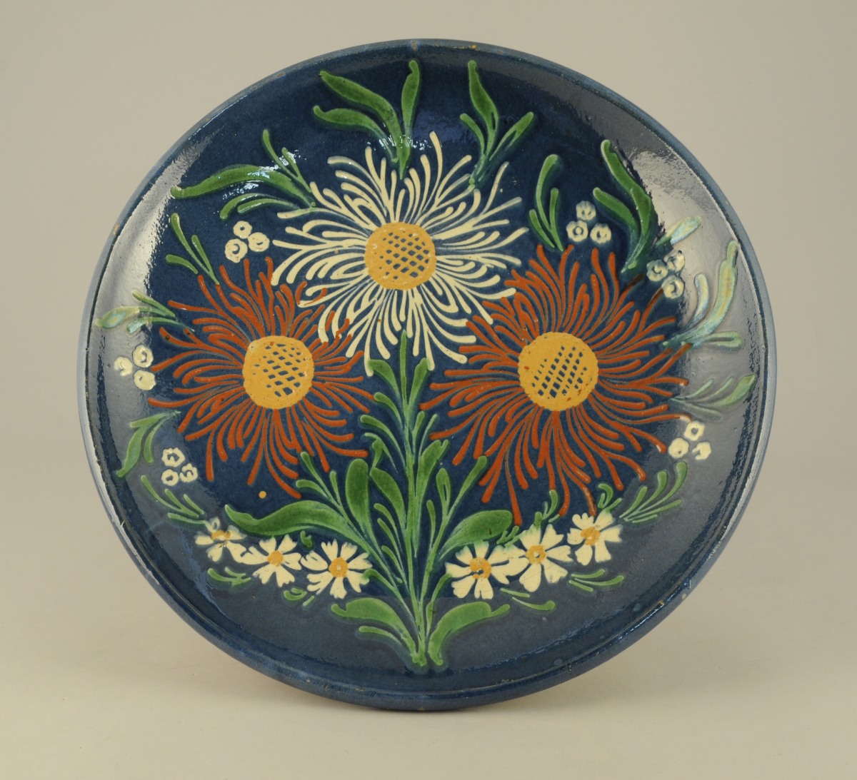JOINT : ALSACE ? PLAT D'APPARAT rond en terre cuite émaillée à décor polychrome sur fond bleu de guirlandes de marguerites au naturel et de trois importantes fleurs rouges et blanches à coeurs jaunes sur tiges feuillagées. Marque en creux "1580 / 9". Travail probablement alsacien. XXème. Diam. 38,5 cm.