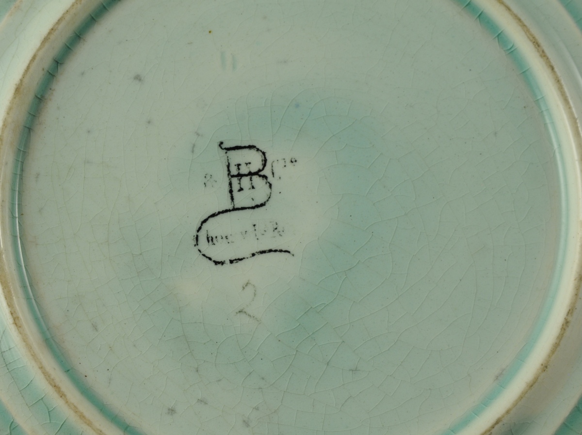CHOISY-LE-ROI. ENSEMBLE DE QUATRE ASSIETTES en barbotine. Décor polychrome au centre d'un bouquet de feuilles et fleurs sur fond marron, composé d'une large feuille de lierre, de fougères et d'églantine, nouées par un ruban mauve. Frise de grecques et de perles marron clair sur l'aile. Revers craquelé vert d'eau. Marquées au tampon du monogramme "HB et Cie / Choisy-le-Roi" pour Boulenger-Hautin et compagnie à Choisy-le-Roi et "02" en creux.
