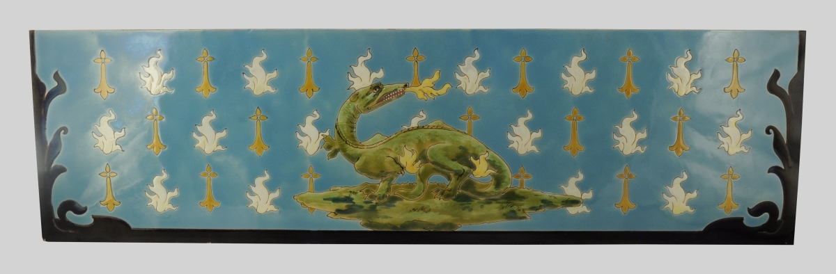 Plaque rectangulaire en faïence polychrome, à décor dans un encadrement d'une salamandre sur un semis azur de flammes et de pattes d'hermines.