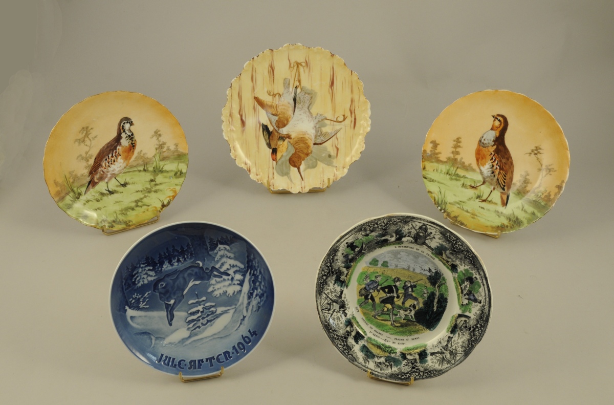 - ASSIETTE à bord mouvementé. Décor polychrome d'un trophée de chasse aux oiseaux. Travail français moderne. Diam. 23,5 cm.
