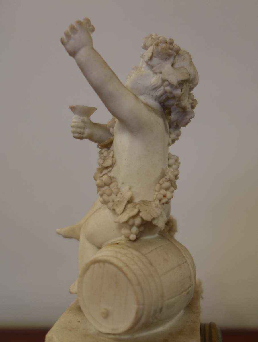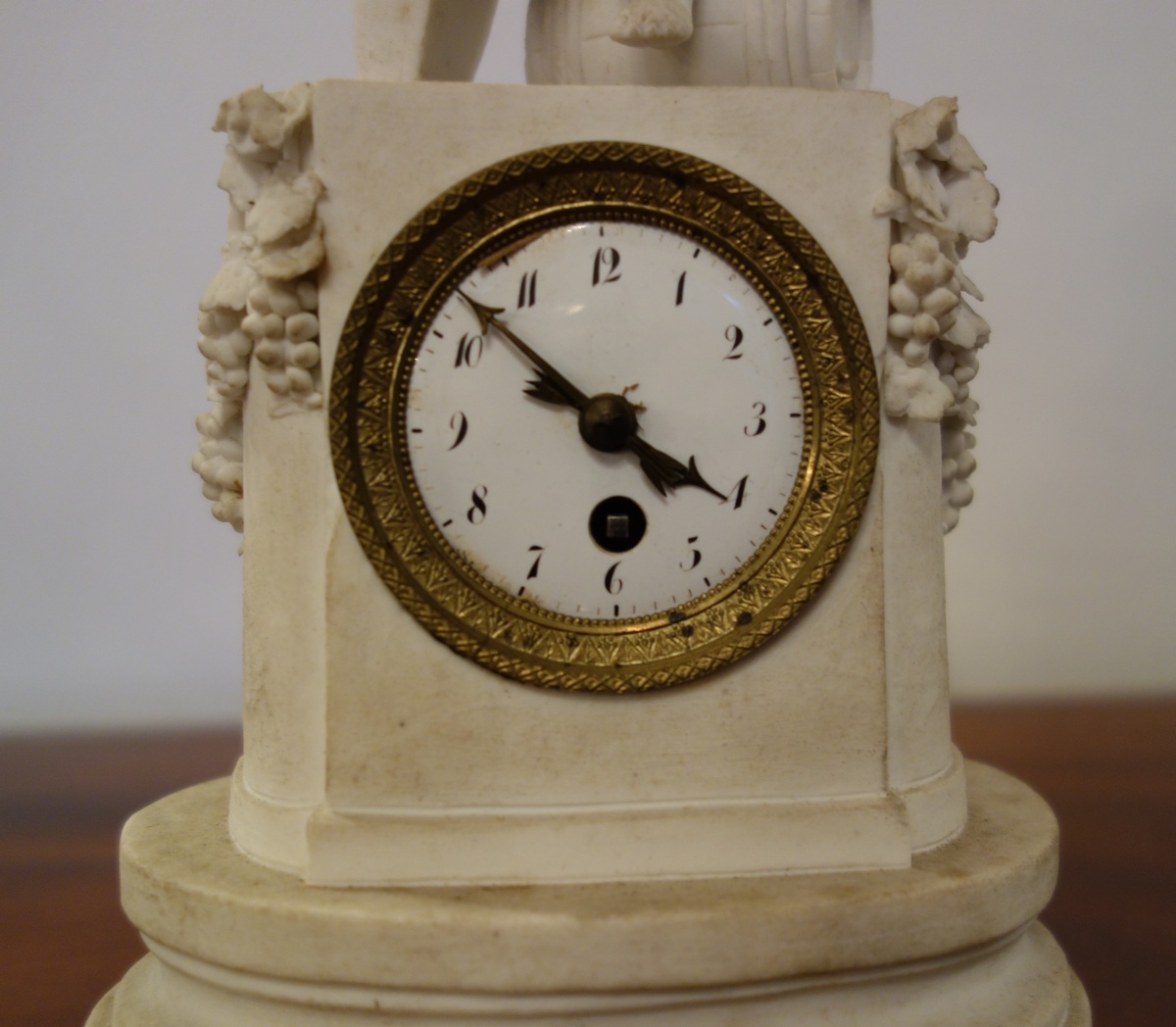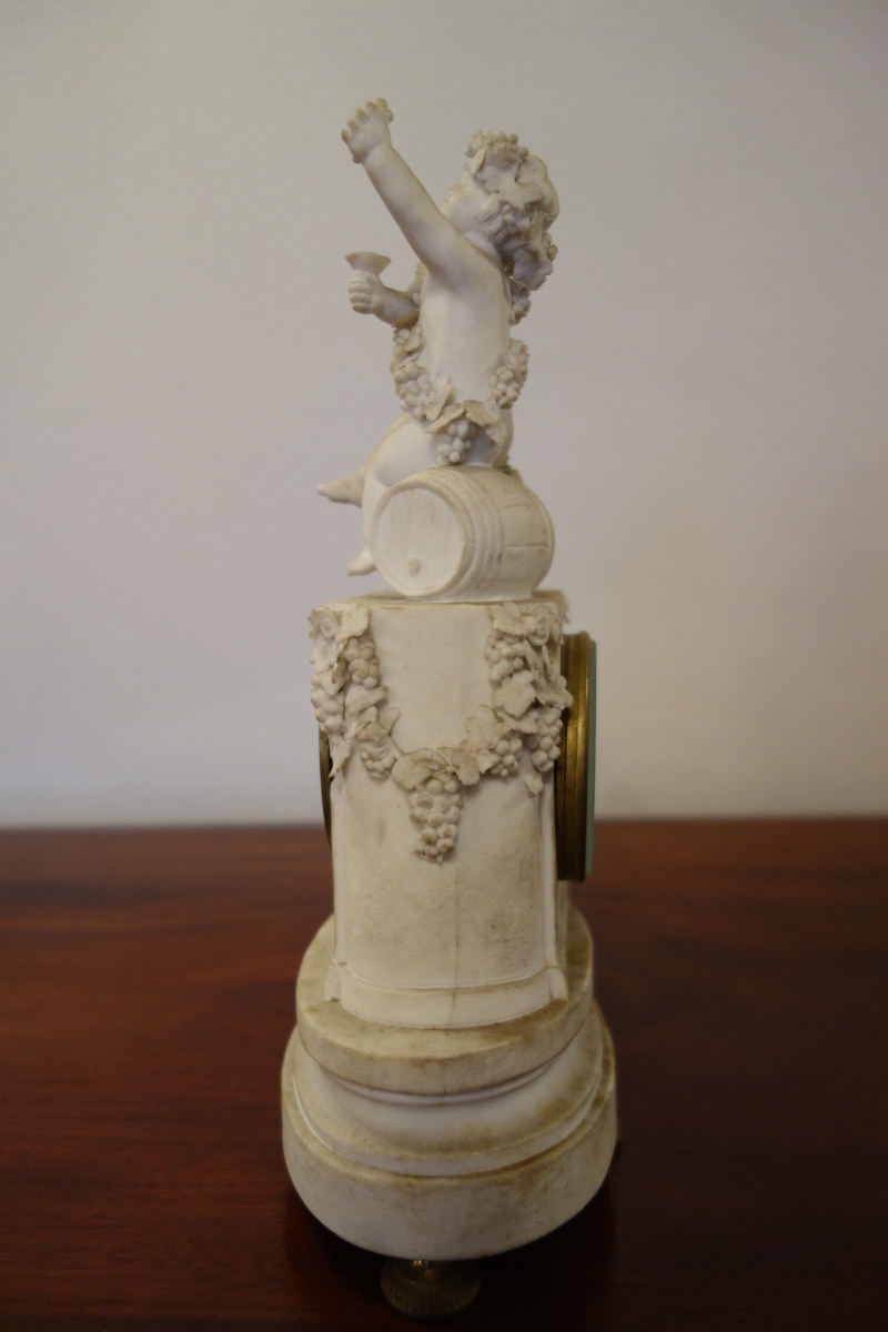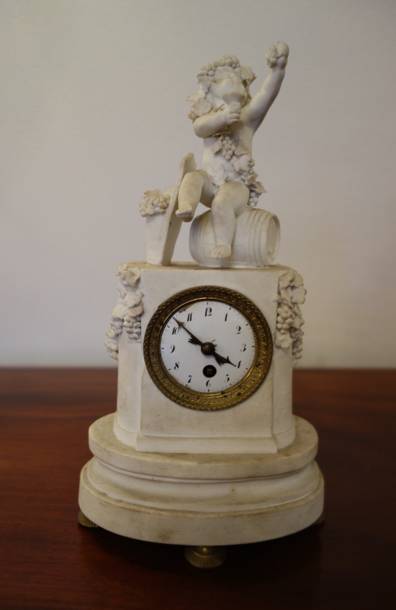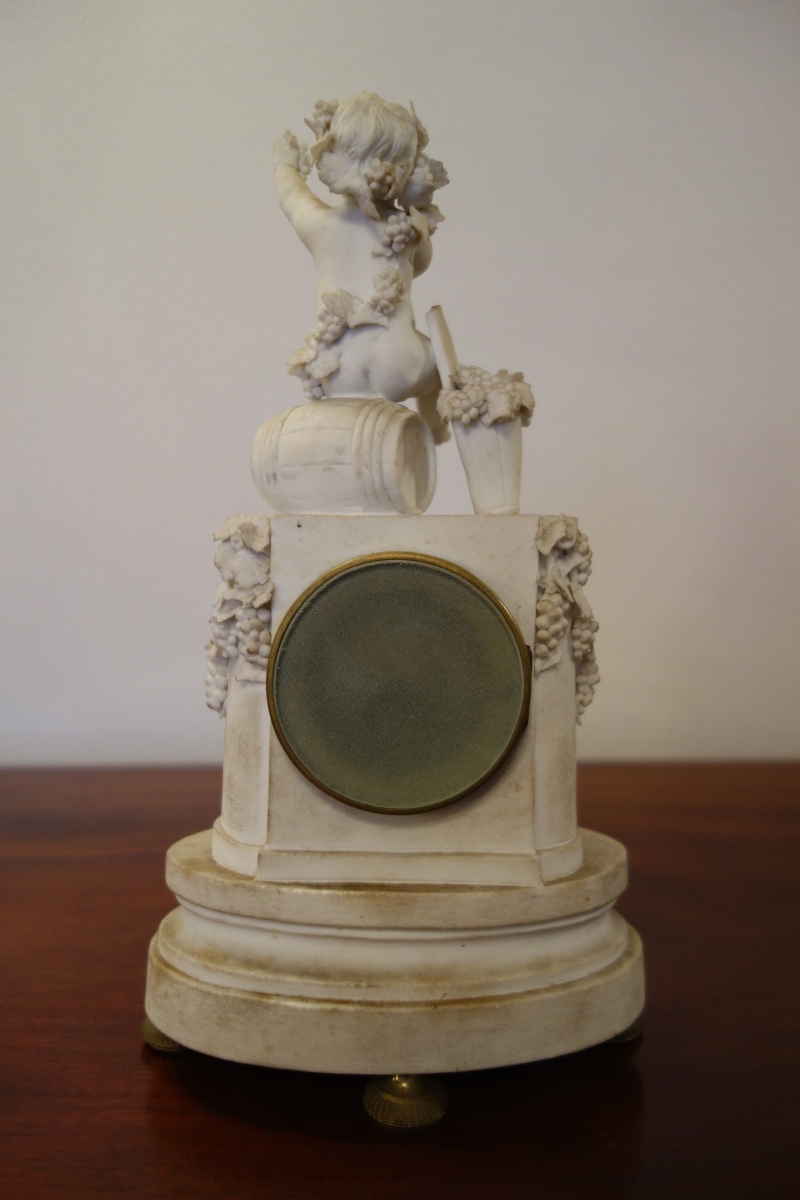 PENDULE BORNE BACHIQUE en biscuit figurant Bachus enfant vendangeur assis sur un tonneau tenant une coupe à la main. Guirlandes et chutes de pampres sur les côtés. Cadran émaillé gradué des minutes, les heures en chiffres arabes, cerclé dans un col en bronze ciselés de perles, entrelacs et frises. Elle repose sur quatre pieds de laiton.