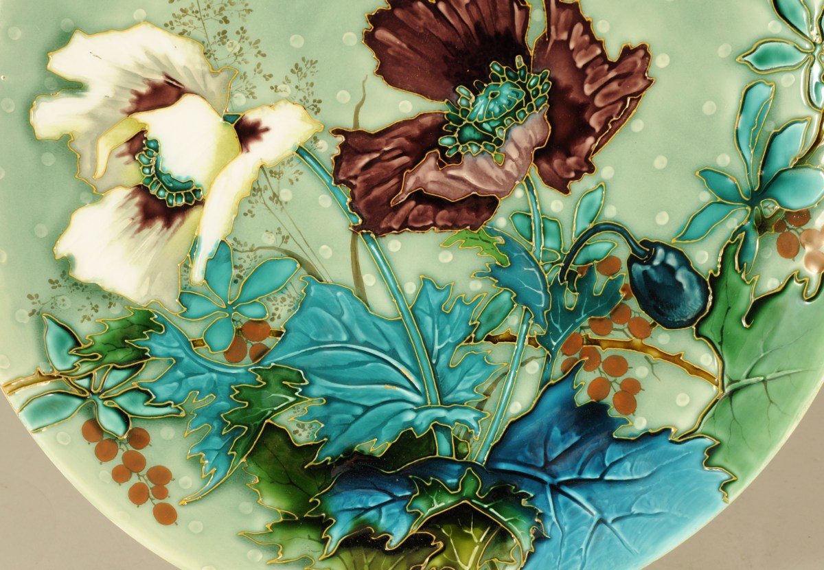 SÈVRES. MILET. GRAND PLAT rond en faïence émaillée à décor polychrome cloisonné aux pavots et au papillon. Signé "Richard" dans le décor pour Émile Richard, peintre de fleurs à la manufacture nationale de porcelaine de Sèvres.