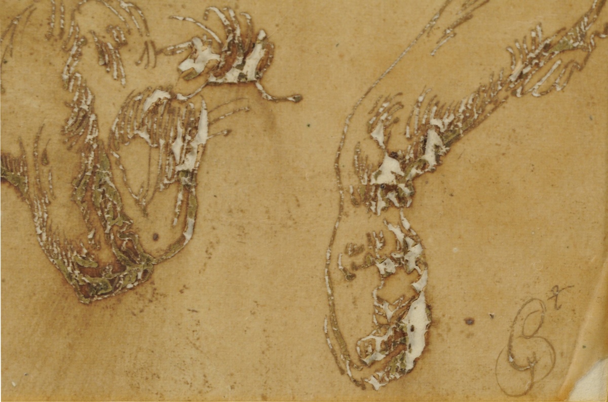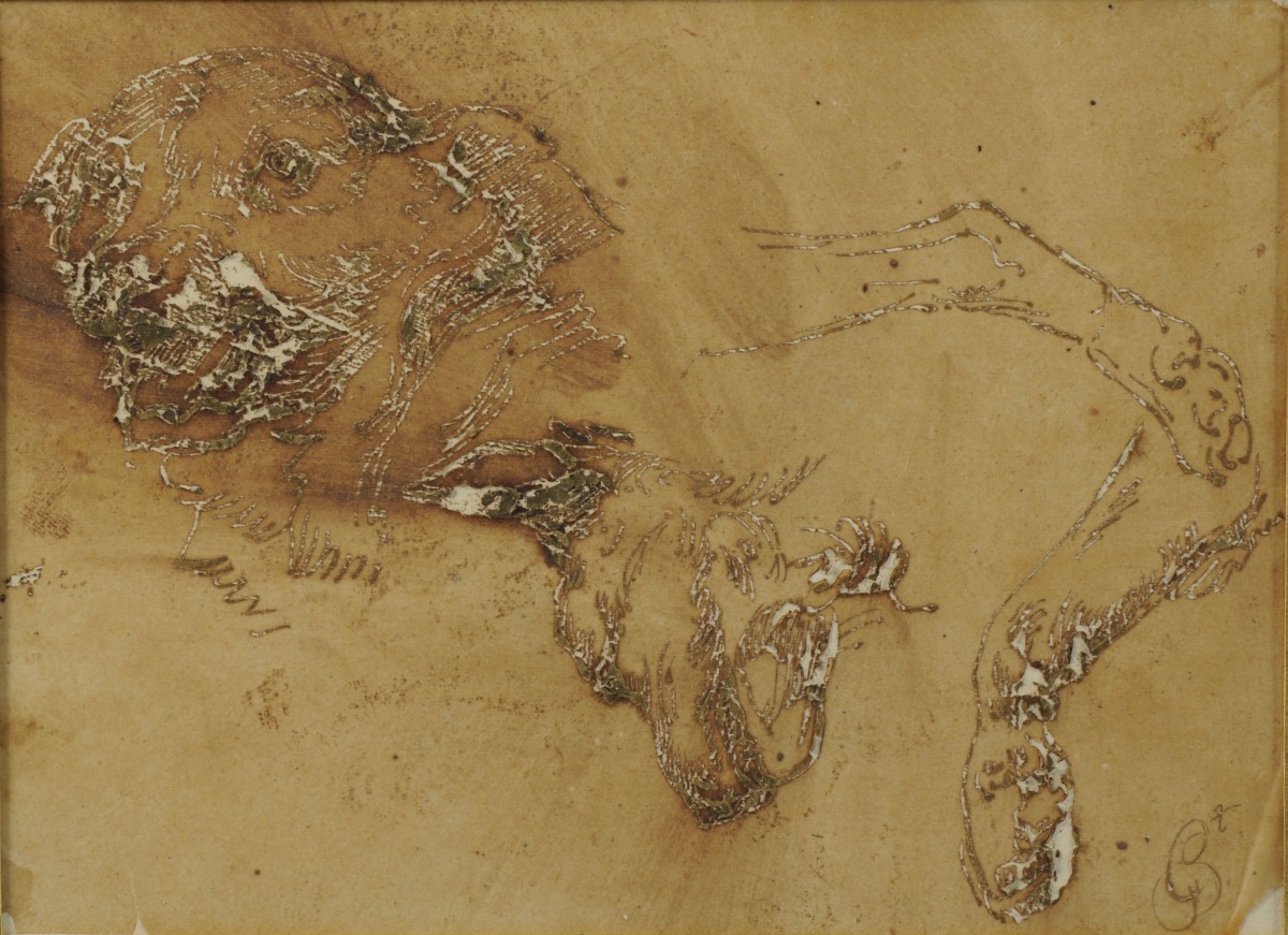 Étude de deux têtes et deux pattes de chien ou de félin.