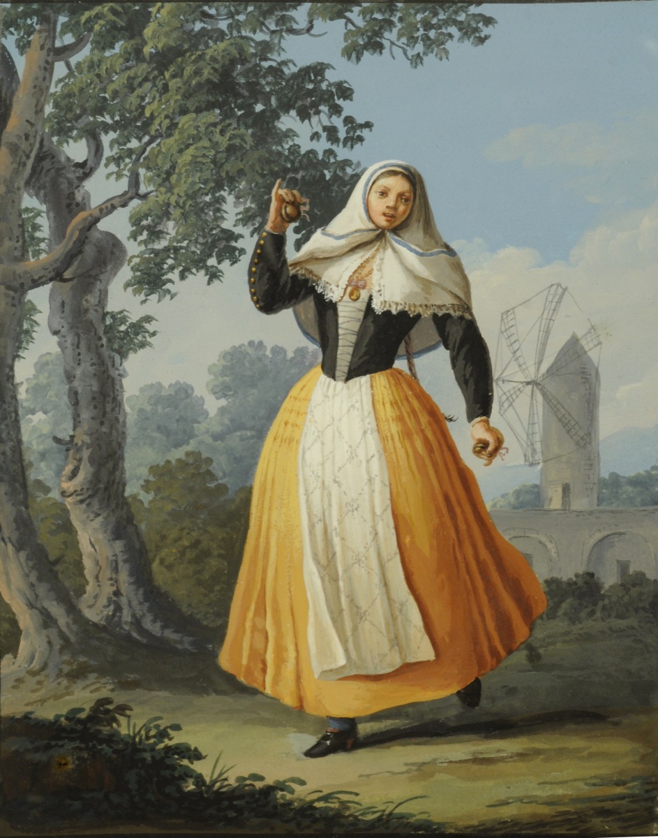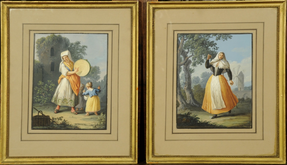 Deux gouaches : Femme au tambourin et enfants du Posillipo et Femme aux castagnettes de Minorca.