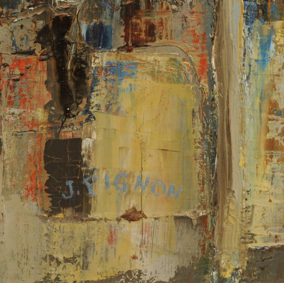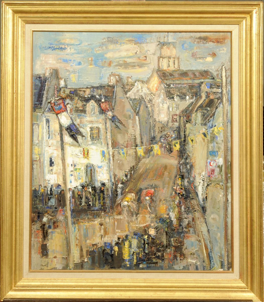 Peintre et sculpteur, Joseph Pignon est un jurassien installé dans le Morbihan. Son travail figuratif a été ponctué par l'abstraction. Défendu un temps par un marchand vannnetais, Boutin, son travail reste largement méconnu. Cette course cycliste un jour de fête nationale à Questembert interpelle par une composition savante accentuant l'effet de vitesse et par un pâte vivante qui révèle un artiste accompli.