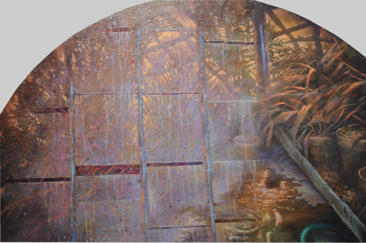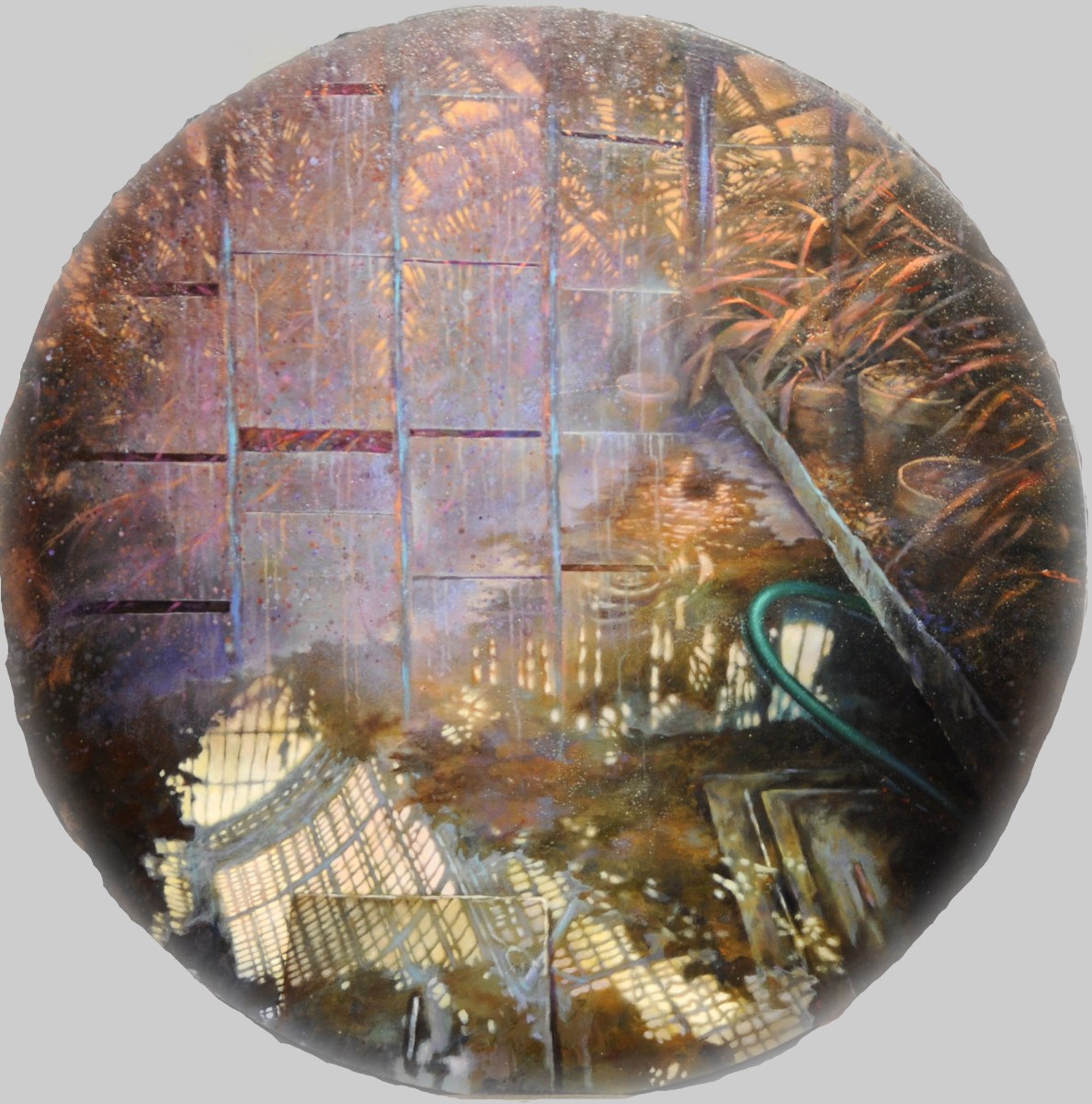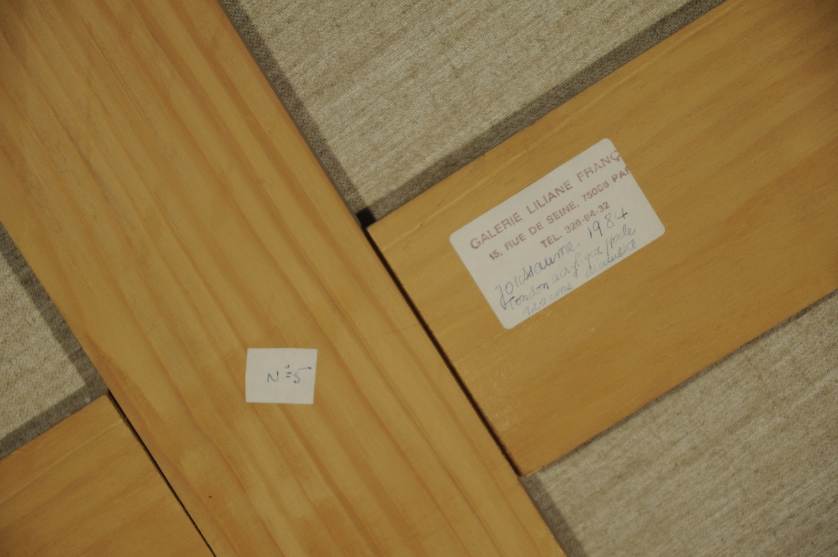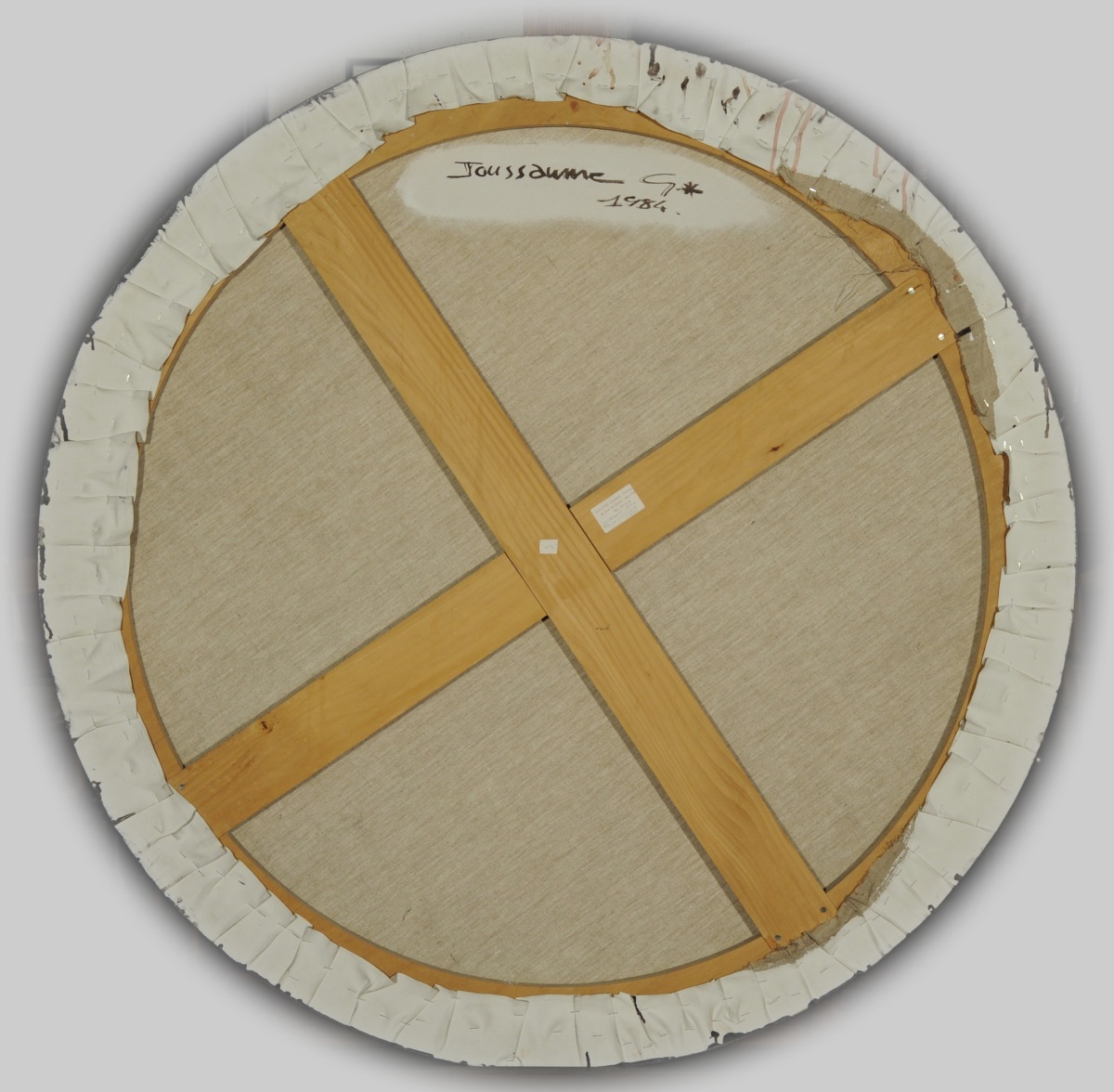Toile de format rond, signée et datée 1984 au dos. Porte une étiquette de la Galerie Liliane François, 15, rue de Seine 75008 Paris.