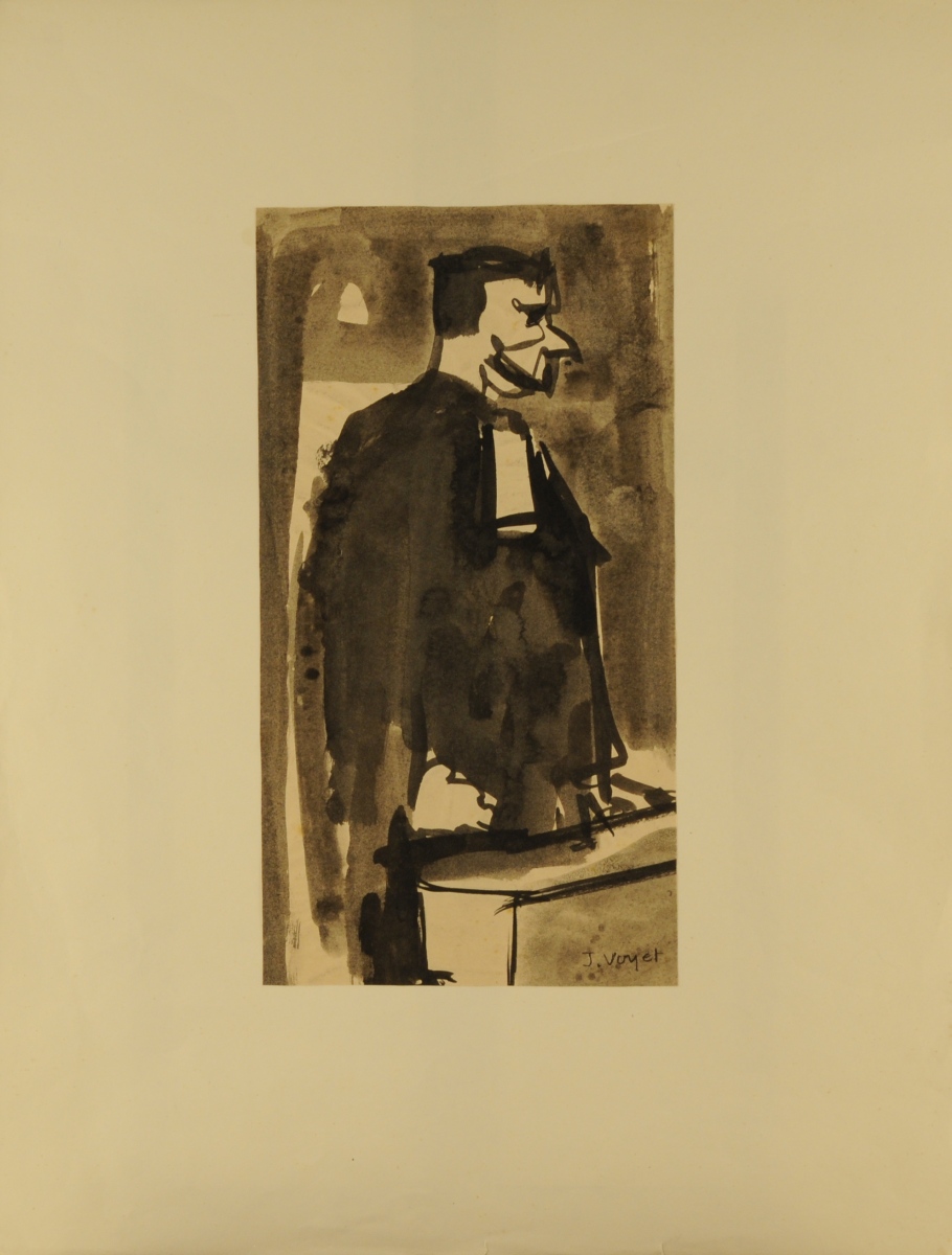 JOINT : CARTE de VOEUX. Gouache aquarellée. Signée J.V et marquée "Heureux jours de fête et très heureuse Nouvelle Année. Jacques et Romanita Voyet".