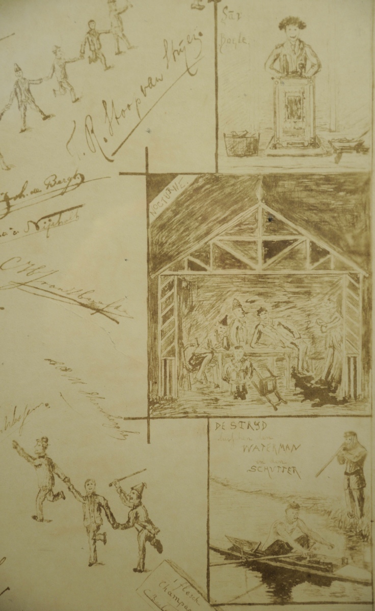 Dessin à l'encre sur papier commémorant l'inauguration d'un club et représentant diverses saynètes festives et comiques encadrant de nombreux autographes. Titré "CLUB - INAUGURATIE" et daté du deux novembre 1892.