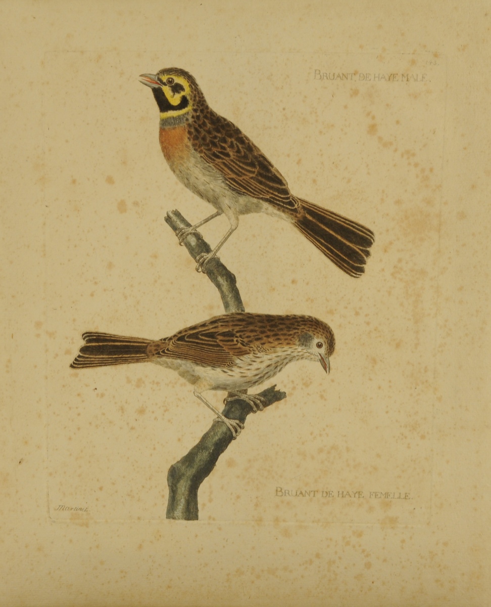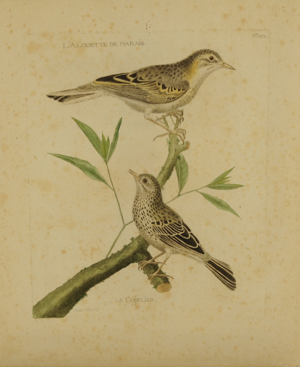 Deux gravures réhaussées en couleur, tirées de l'ouvrage de Buffon, Histoire Naturelle des oiseaux (Imprimerie Royale, 1770-1786 ?).