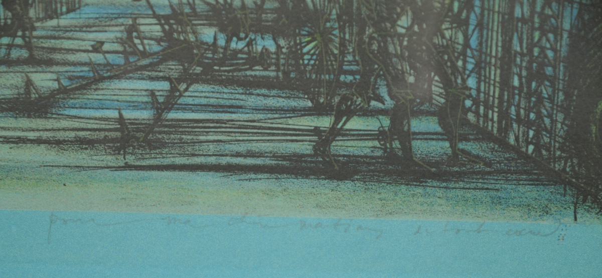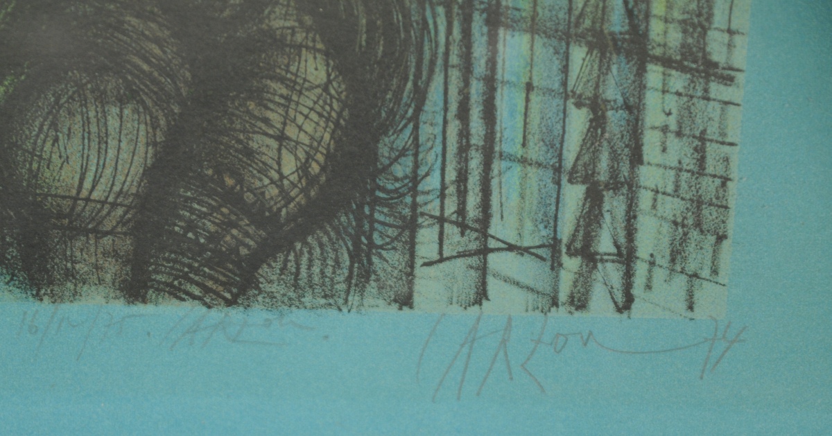 Lithographie en couleurs sur papier bleu, signée et datée 74 en bas à droite, justifiée 18/70 (?) Dédicace "Pour ma chère Martine, de tout coeur. 16/10/75. Carzou".