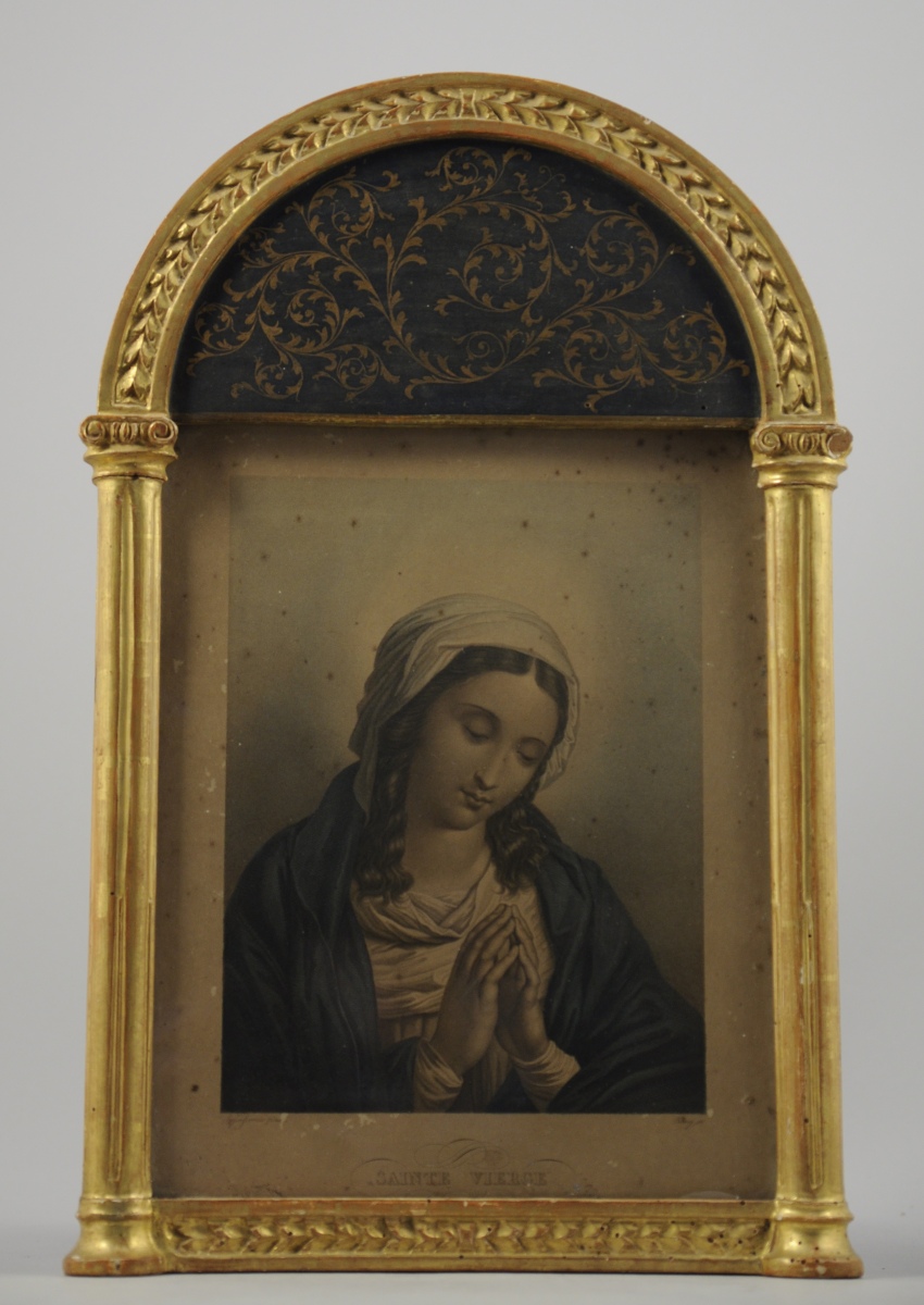 - Saint Vierge dans un beau cadre en bois sculpté et doré et peint de volutes dans le goût de la Renaissance. XIXème. Haut. 45, Larg, 29 cm avec le cadre. (petits manques)