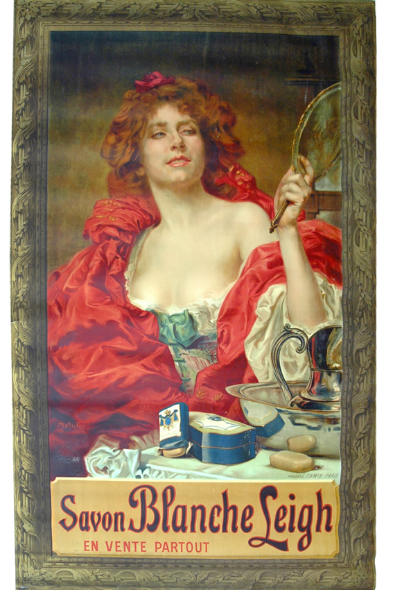 AFFICHE publicitaire pour le savon Blanche Leigh. Marquée "Imprimé sur la plus grande machine du monde". Procédé CAMIS, 172, quai de Jemmapes, Paris. Vers 1900. 160 x 250 cm. (importantes déchirures)