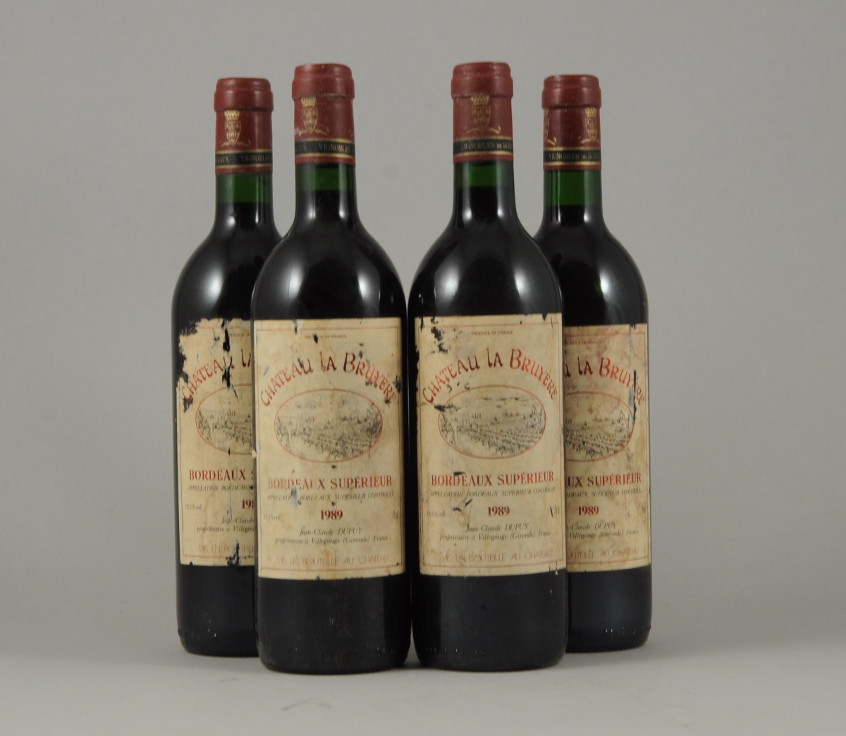 BORDEAUX SUPERIEUR, Château La Bruyére, 1989. 4 bouteilles. Etiquette légèrement endommagées.