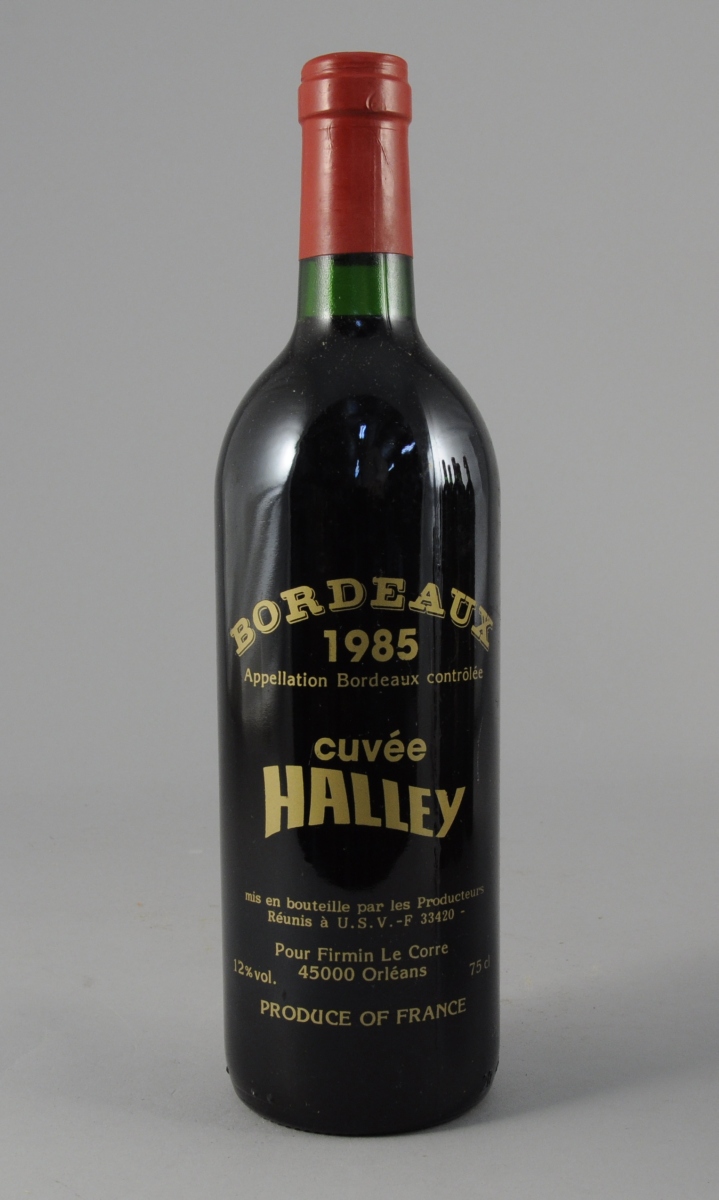 BORDEAUX, Cuvée Halley, 1985. 6 bouteilles commémorative du passage de la comète de Halley en 1986. Les Producteurs Réunis à U.S.V.F. F-33420 pour Firmin Le Corre à Orléans. Dernières bouteilles d'une cuvée de 2500 flacons. Dessin de Mito Malus.
