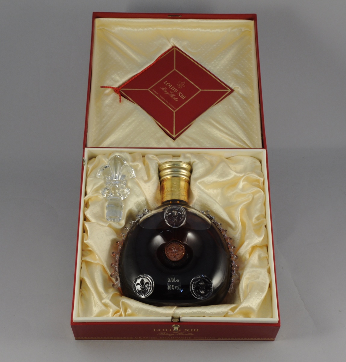 COGNAC, Grande Champagne Cognac, Rémy Martin, cuvée Louis XIII "Petit Louis", 1989 (?). 1 bouteille en cristal de Baccarat signée et numérotée "x 6071". Dans son écrin avec livret et facture d'achat d'octobre 1989 par la maison Rémy & Associés.